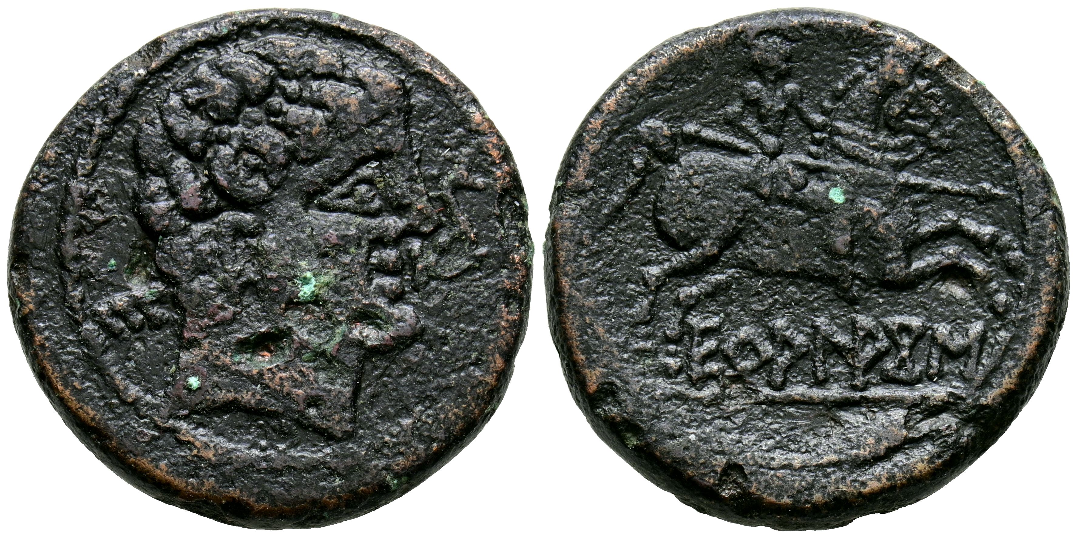 ECUALACOS (Soria-Guadalajara area). As. (Ae. 11.78g/25mm). 120-20 AD (FAB-969). Anv: Male head to the right, in front a dolphin, behind Iberian letter: E. Rev: Horseman with lance to the right, below legend: ECuALACoS. Very Fine-. Oxidations.