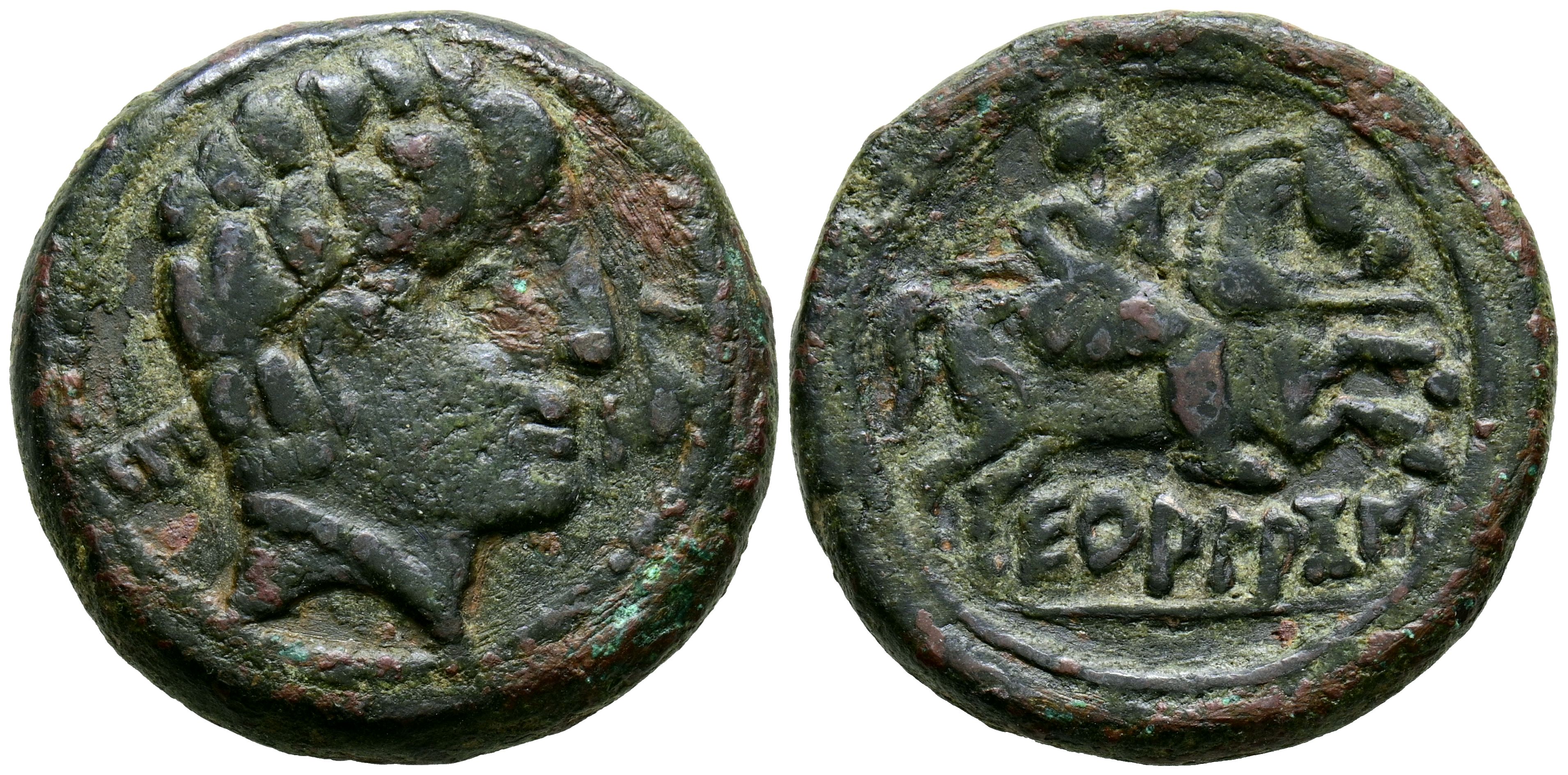 English ECUALACOS (Soria-Guadalajara area). As. (Ae. 14.92g/27mm). 120-20 AD (FAB-969). Anv: Male head to the right, in front a dolphin, behind Iberian letter: E. Rev: Horseman with lance to the right, below legend: ECuALACoS. Very Fine-.