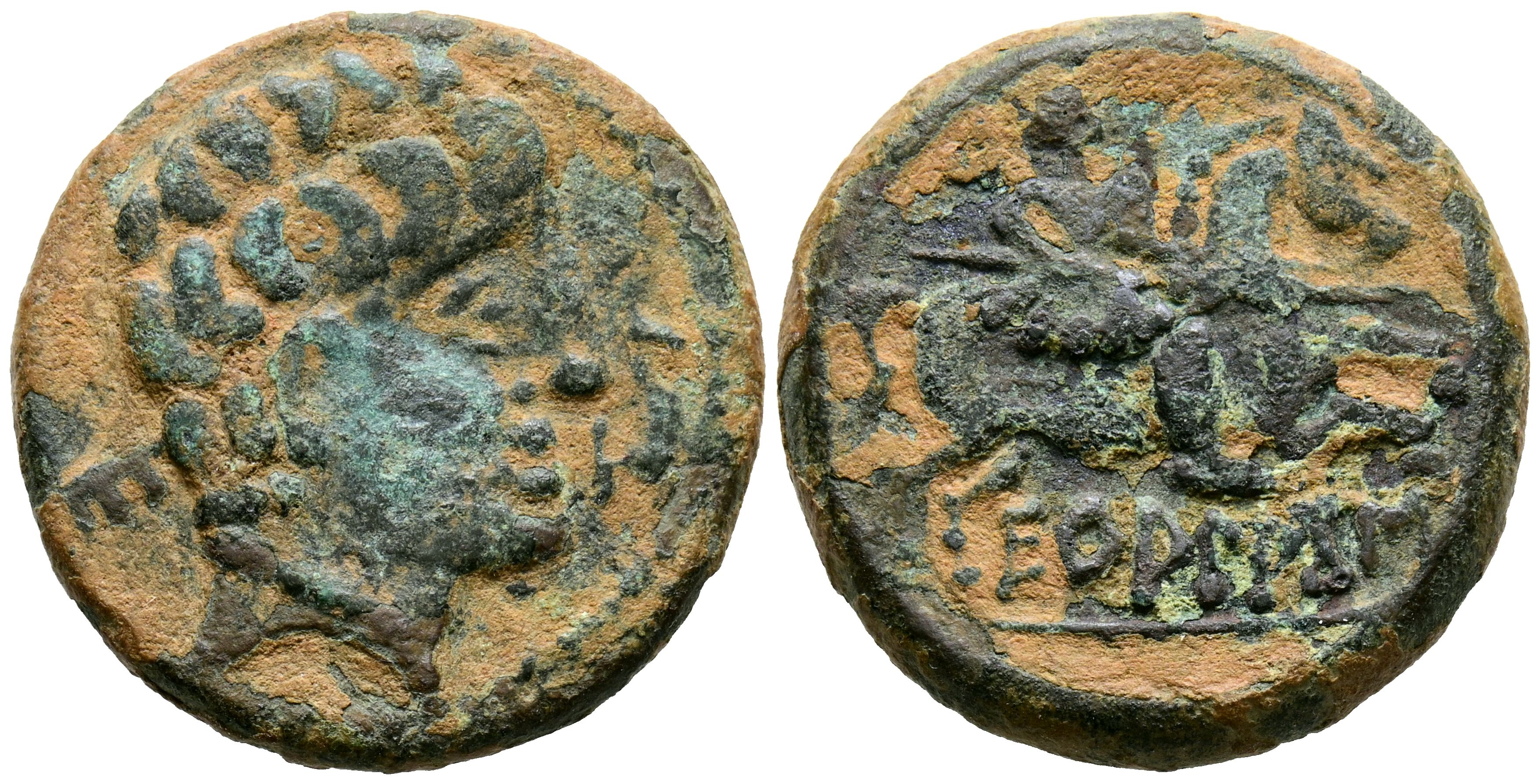 ECUALACOS (Soria-Guadalajara area). As. (Ae. 11.88g/24mm). 120-20 AD (FAB-969). Anv: Male head to the right, in front a dolphin, behind Iberian letter: E. Rev: Horseman with lance to the right, below legend: ECuALACoS. Very Fine-.