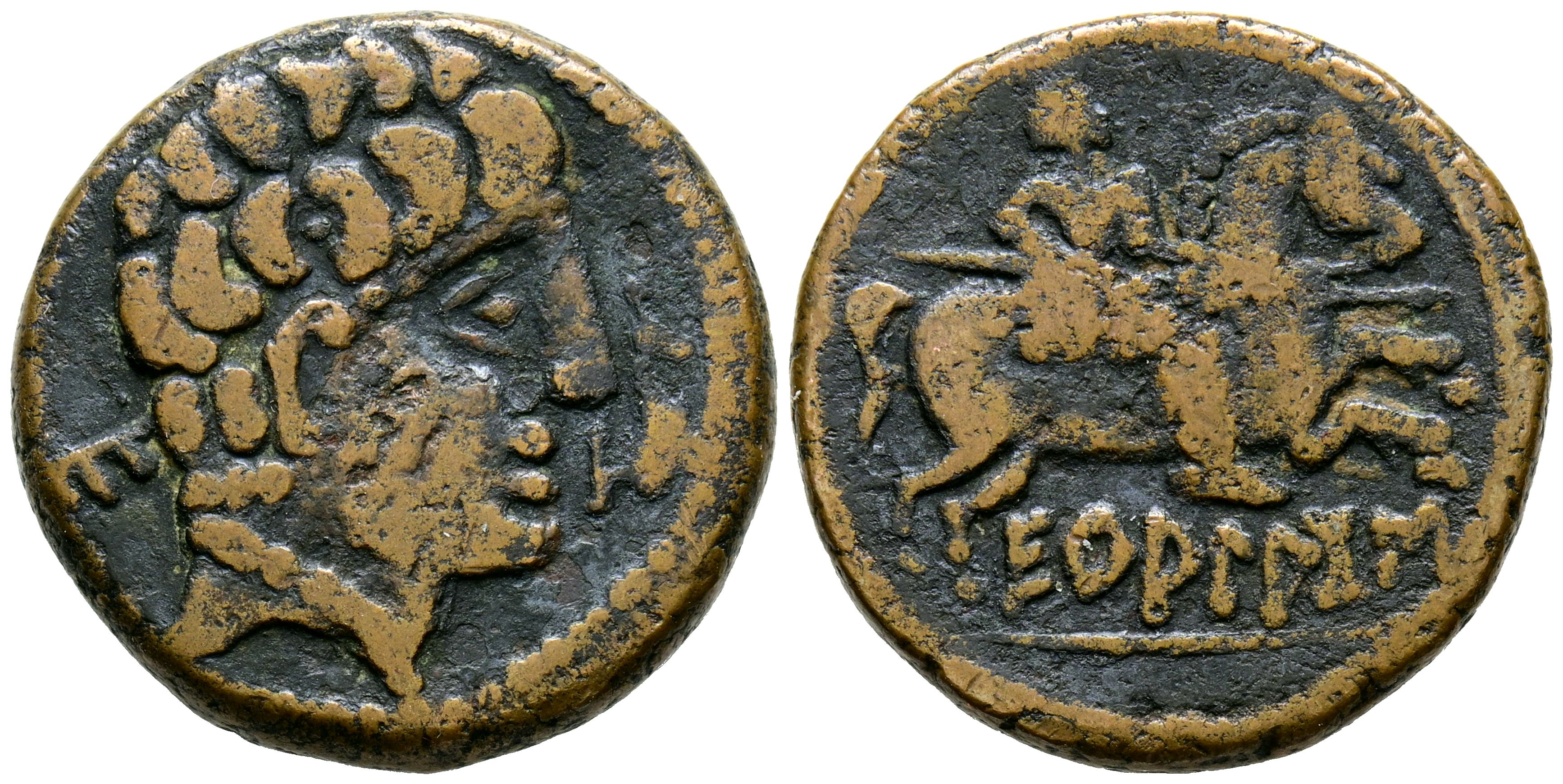 ECUALACOS (Soria-Guadalajara area). As. (Ae. 10.41g/24mm). 120-20 AD (FAB-969). Anv: Male head to the right, in front a dolphin, behind Iberian letter: E. Rev: Horseman with lance to the right, below legend: ECuALACoS. Good Fine.