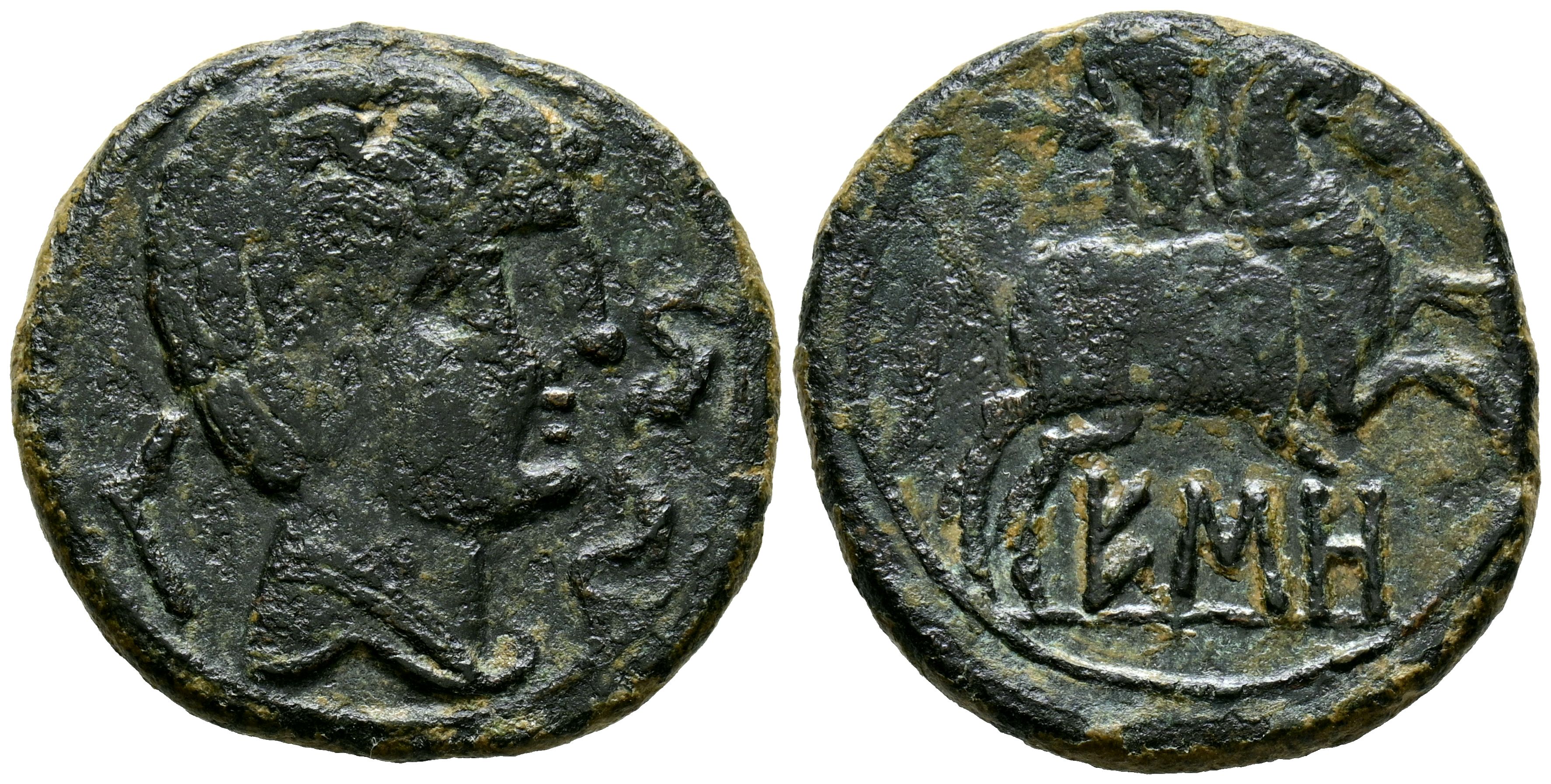 ESO (Isona, Lérida). As. (Ae. 8.51g/25mm). 120-20 Fine (FAB-1291). Obv: Male head to the right, behind Iberian letter: Ce, in front two dolphins. Reverse: Horseman with palm to the right, below Iberian legend on line: ESO. Very Fine.