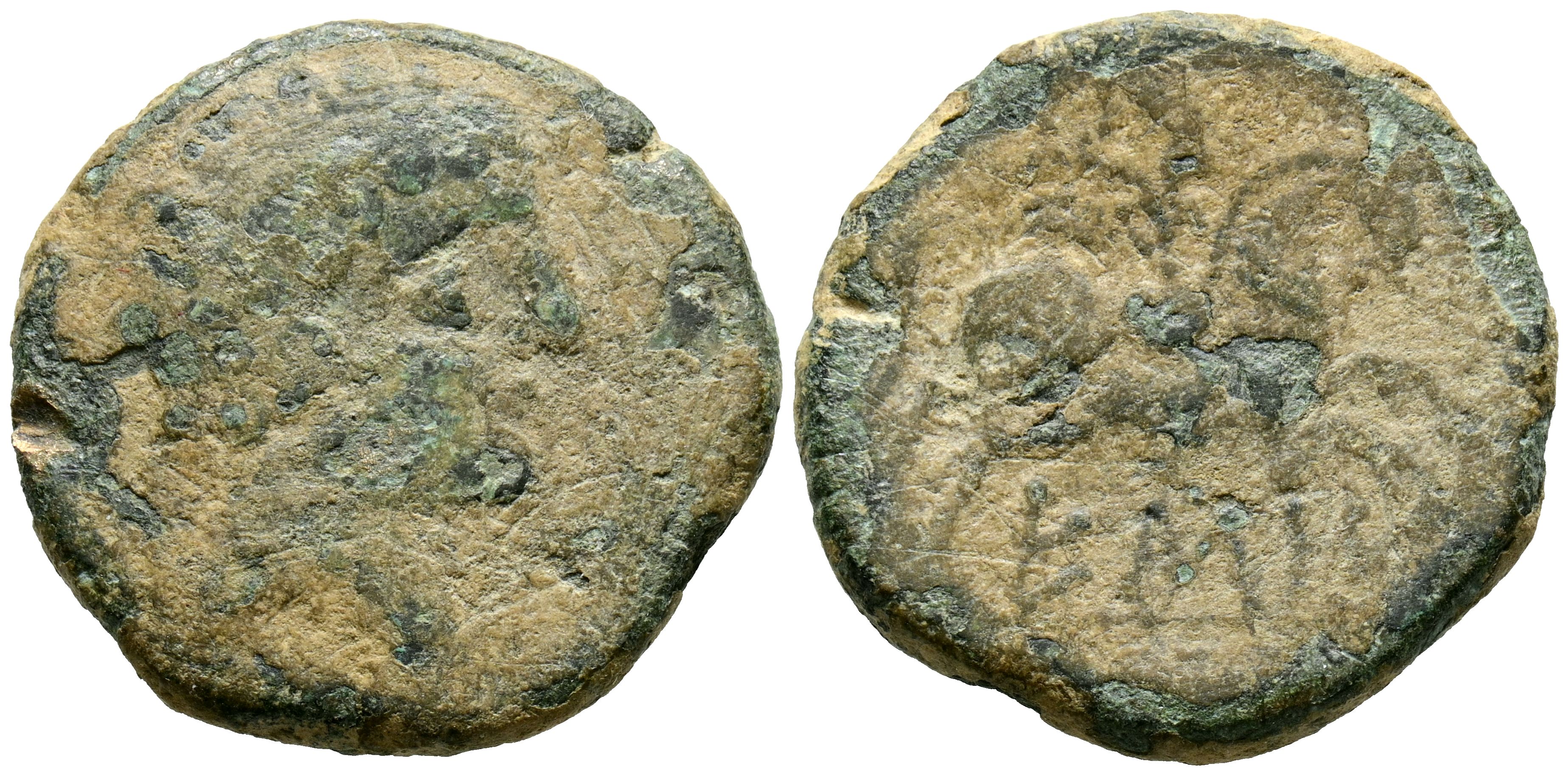 ESO (Isona, Lérida). As. (Ae. 11.14g/26mm). 120-20 Fine (FAB-1291). Obverse: Male head to the right, behind Iberian letter Ce, in front two dolphins. Reverse: Horseman with palm to the right, below Iberian legend: ESO. Good Fine.
