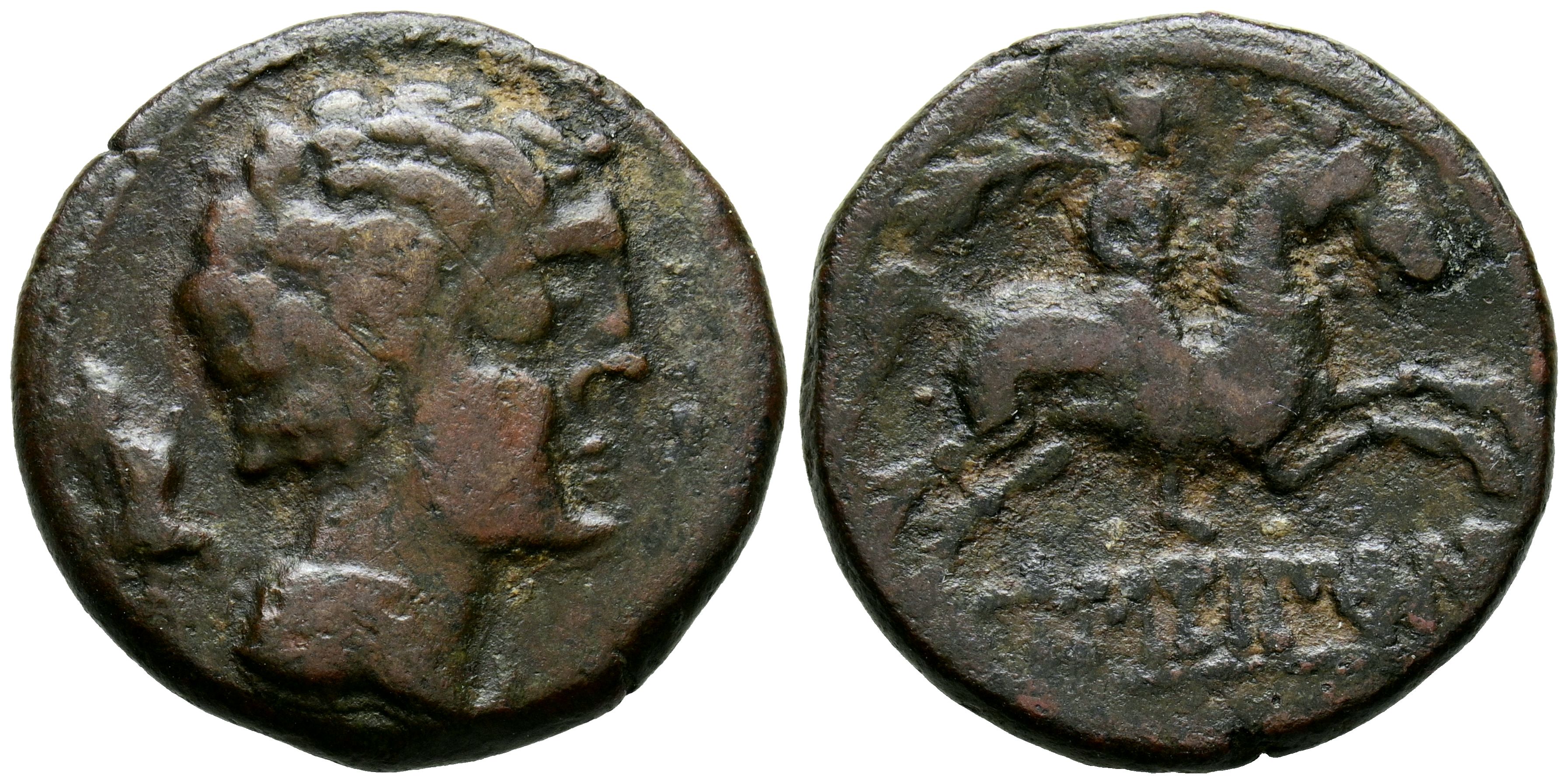 English EUSTIBAICULA (Vic region). As. (Ae. 9.06g/25mm). 120-20 Fine (FAB-1297). Anv: Male head to the right, wild boar behind. Rev: Horseman with palm to the right, below Iberian legend: EUSTiBaICuLA. VF-.
