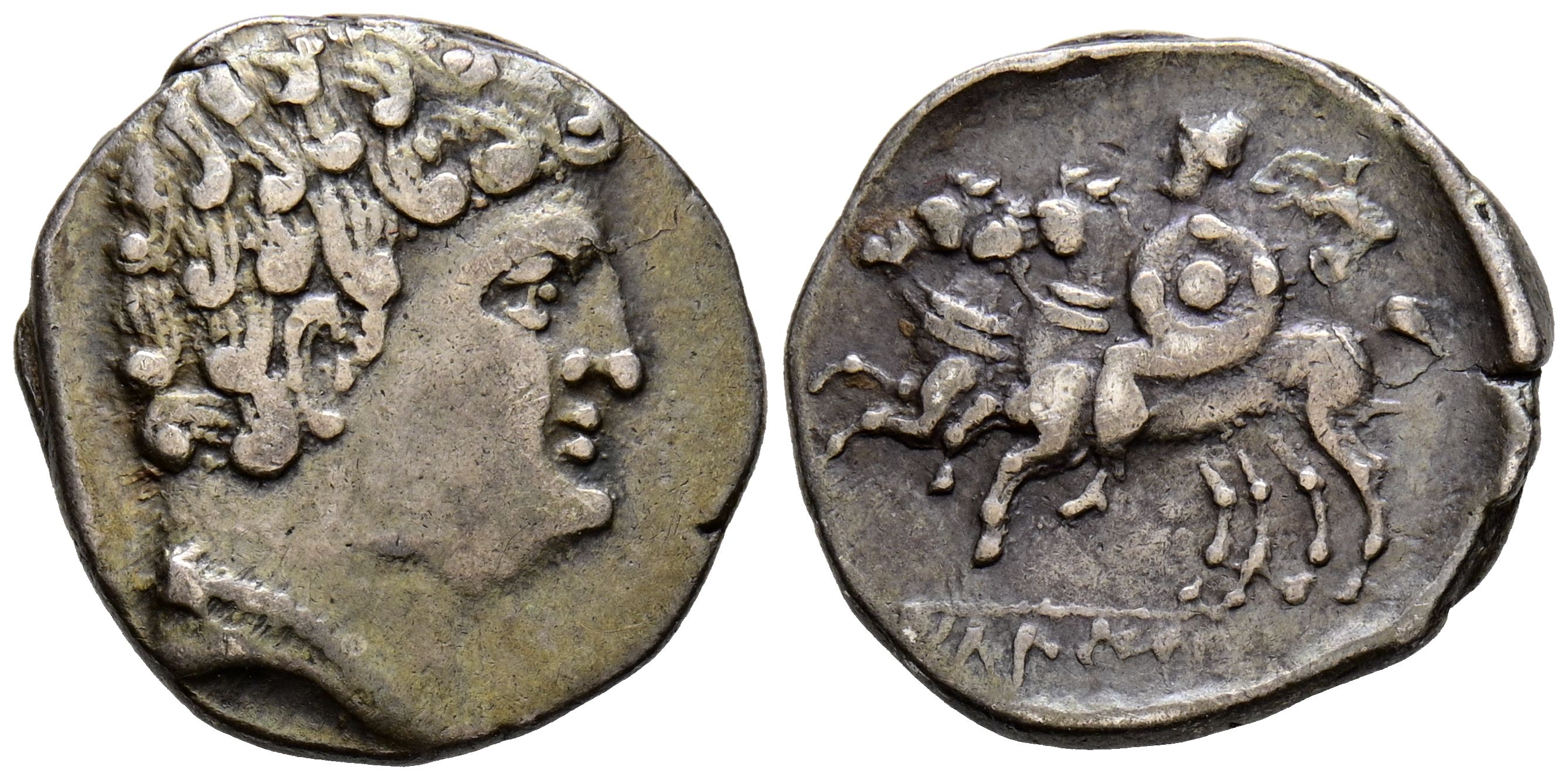 English ICALCUSCEN (Iniesta, Cuenca). Denarius. (Ar. 4.09g/19mm). 120-20 Fine (FAB-1396). Anv: Male head right. Rev: Horseman with lance and shield on two horses left, below Iberian legend below line: ICaLCuSCeN. VF-.