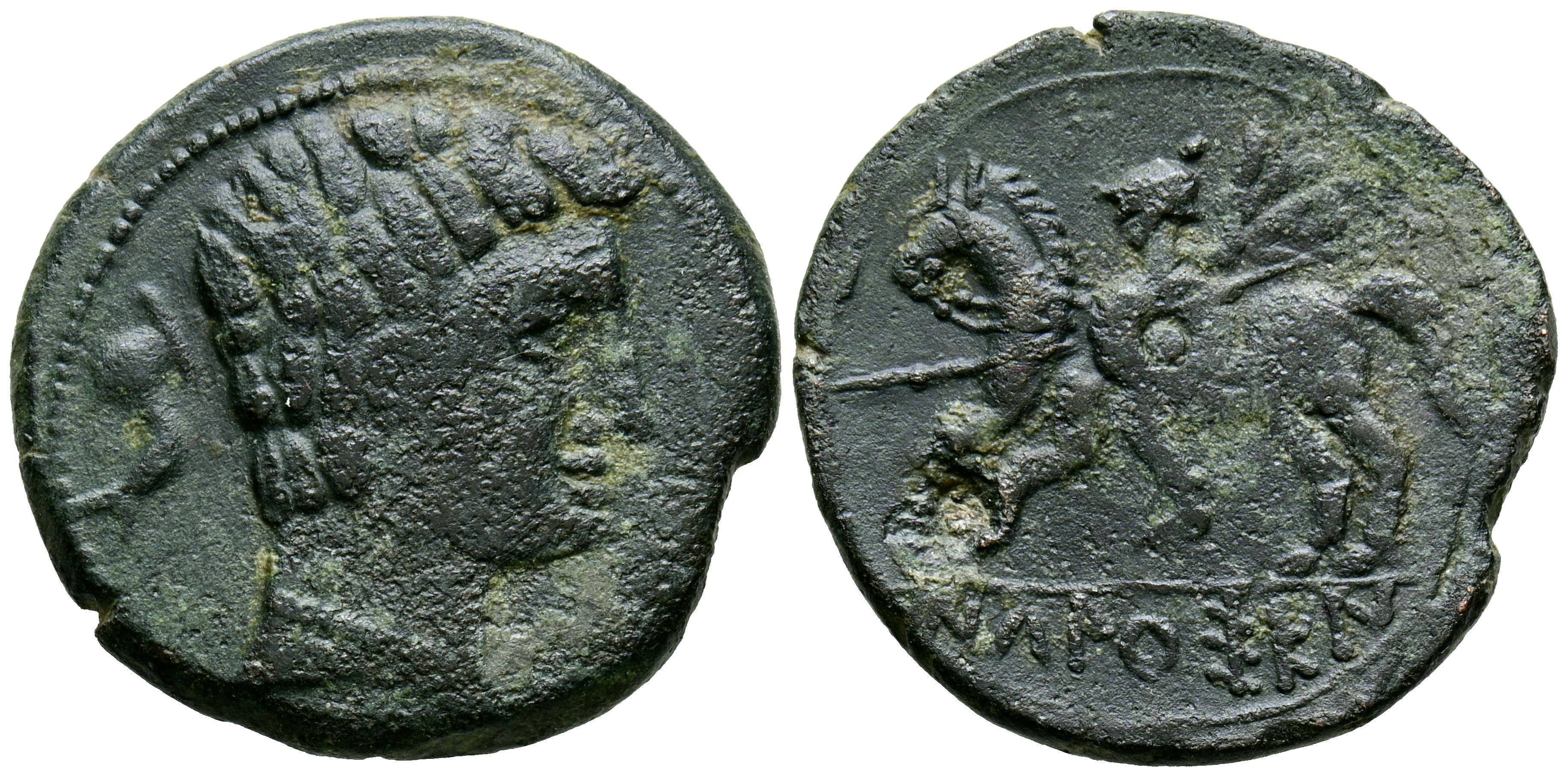 English ICALCUSCEN (Iniesta, Cuenca). As. (Ae. 8.73g/25mm). 120-20 Fine (FAB-1399). Anv: Male head right, behind dolphin. Rev: Horseman with spear and shield left, below Iberian legend: ICaLCuSCeN. VF-.