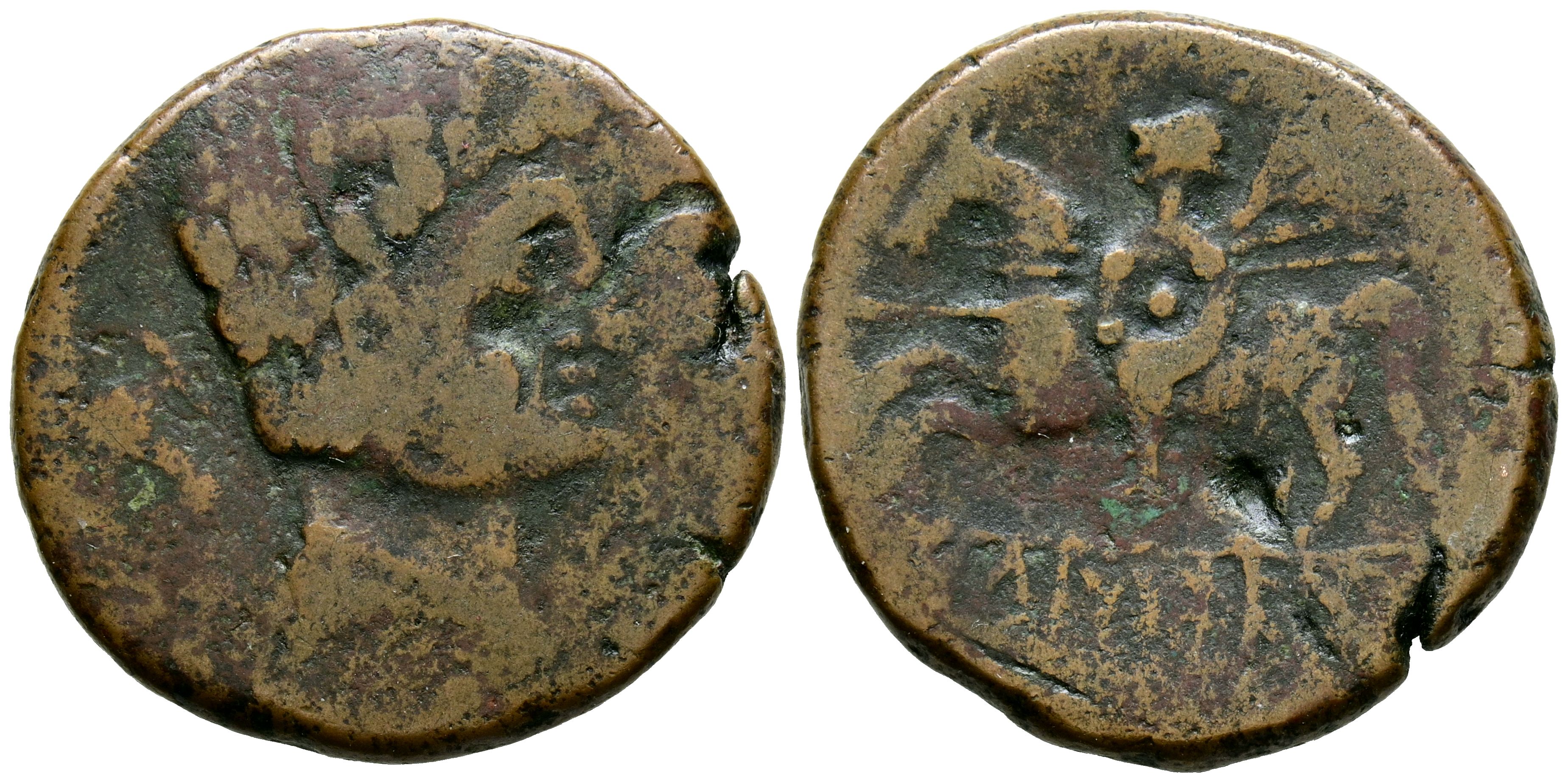 ICALCUSCEN (Iniesta, Cuenca). As. (Ae. 9.99g/26mm). 120-20 Fine (FAB-1399). Anv: Male head right, behind dolphin. Rev: Horseman with spear and shield left, below Iberian legend: ICaLCuSCeN. Fine.