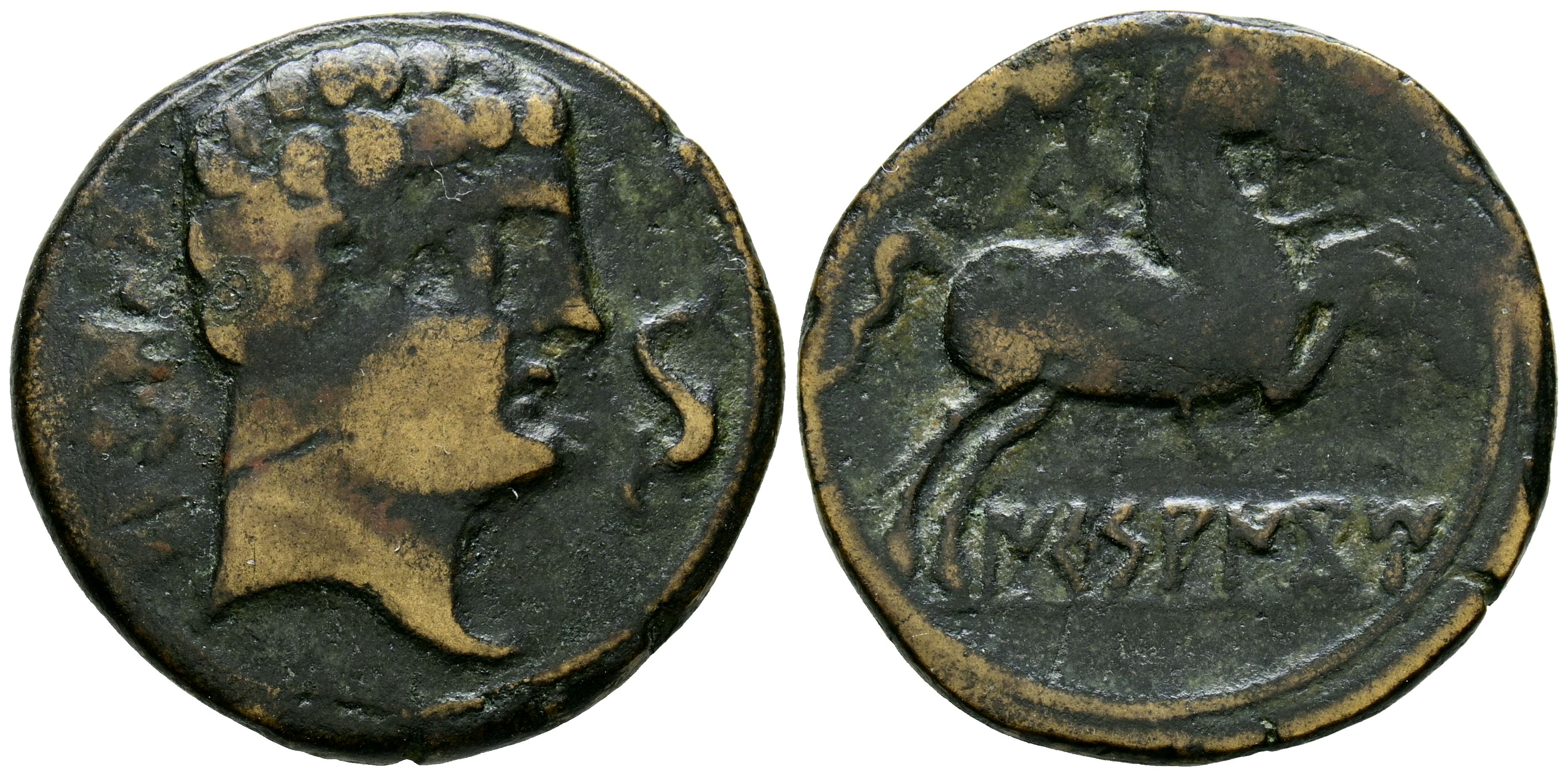 ICESANCOM COMBOUTO (Alcalá de Henares, Madrid). As. (Ae. 8.09g/26mm). 120-200 Fine (FAB-1421). Anv: Male head to the right, in front a dolphin, behind Iberian legend: CoNBoUTo. Rev: Horseman with lance to the right, below Iberian legend: ICeSANCoM. VF-.