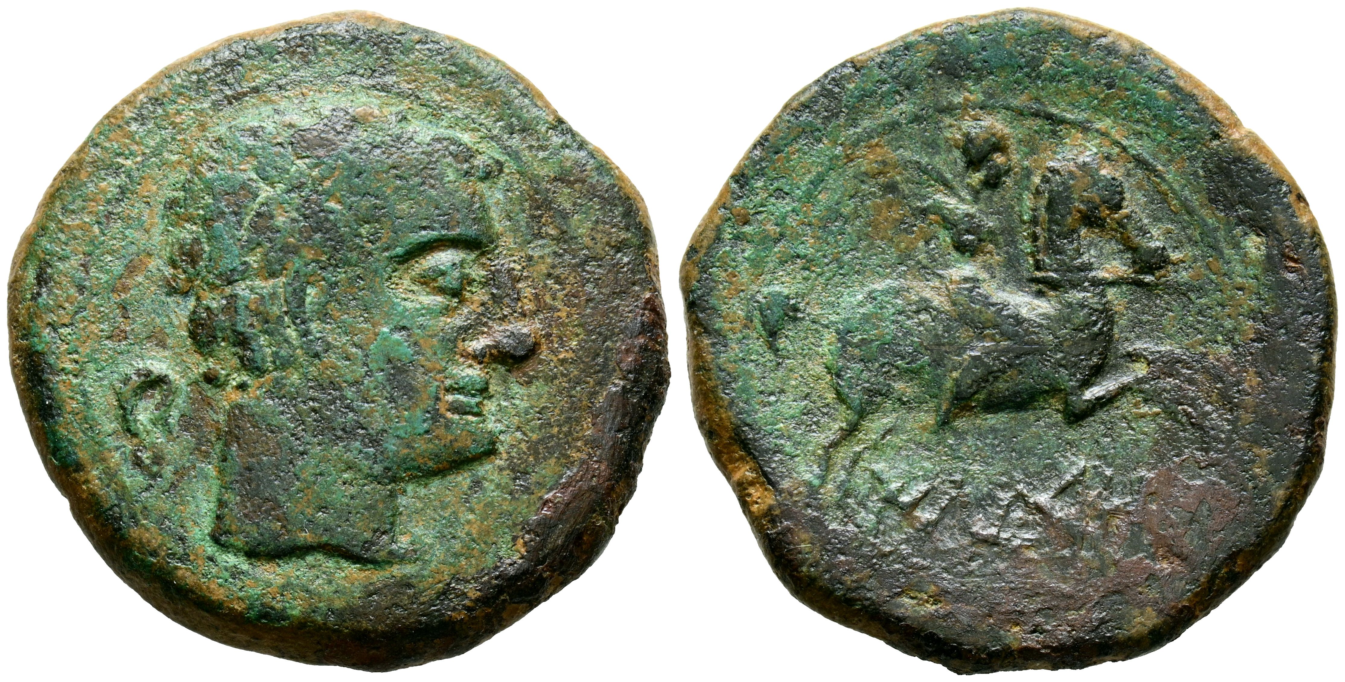 ILDURO (Mataró, Barcelona). As. (Ae. 17.64g/31mm). 120-20 Fine (Fab-1438). Anv: Male diademed head right, behind ear. Rev: Horseman with lance and cape right, below Iberian legend above line: ILDuRO. VF-.