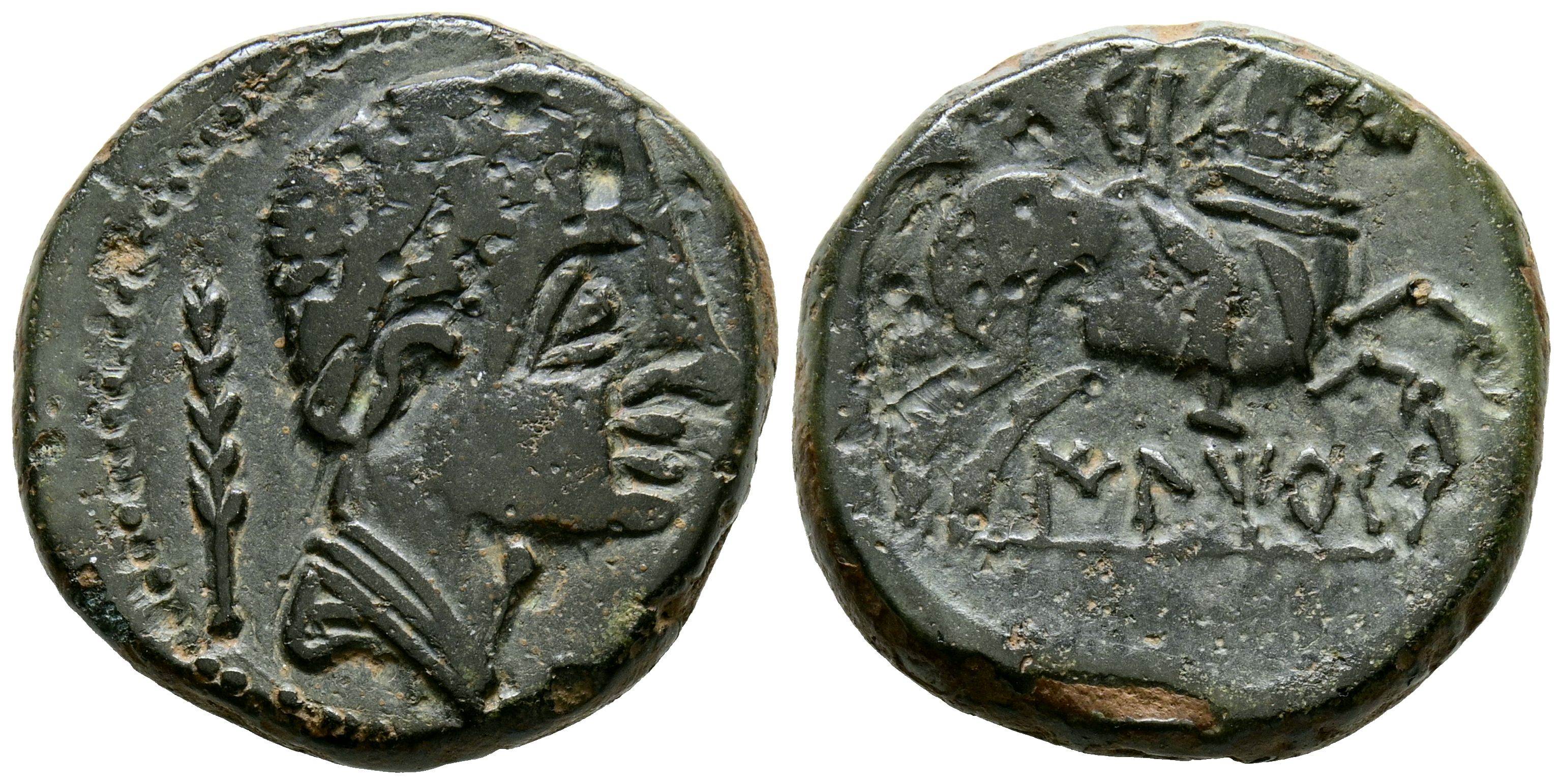 ILTIRCESCEN (Lérida). As. (Ae. 8.21g/22mm). 120-20 Fine (FAB-1446). Anv: Male head to the right, behind a grain of wheat. Reverse: Horseman with palm to the right, below legend: ILTIRCeSCeN. VF.