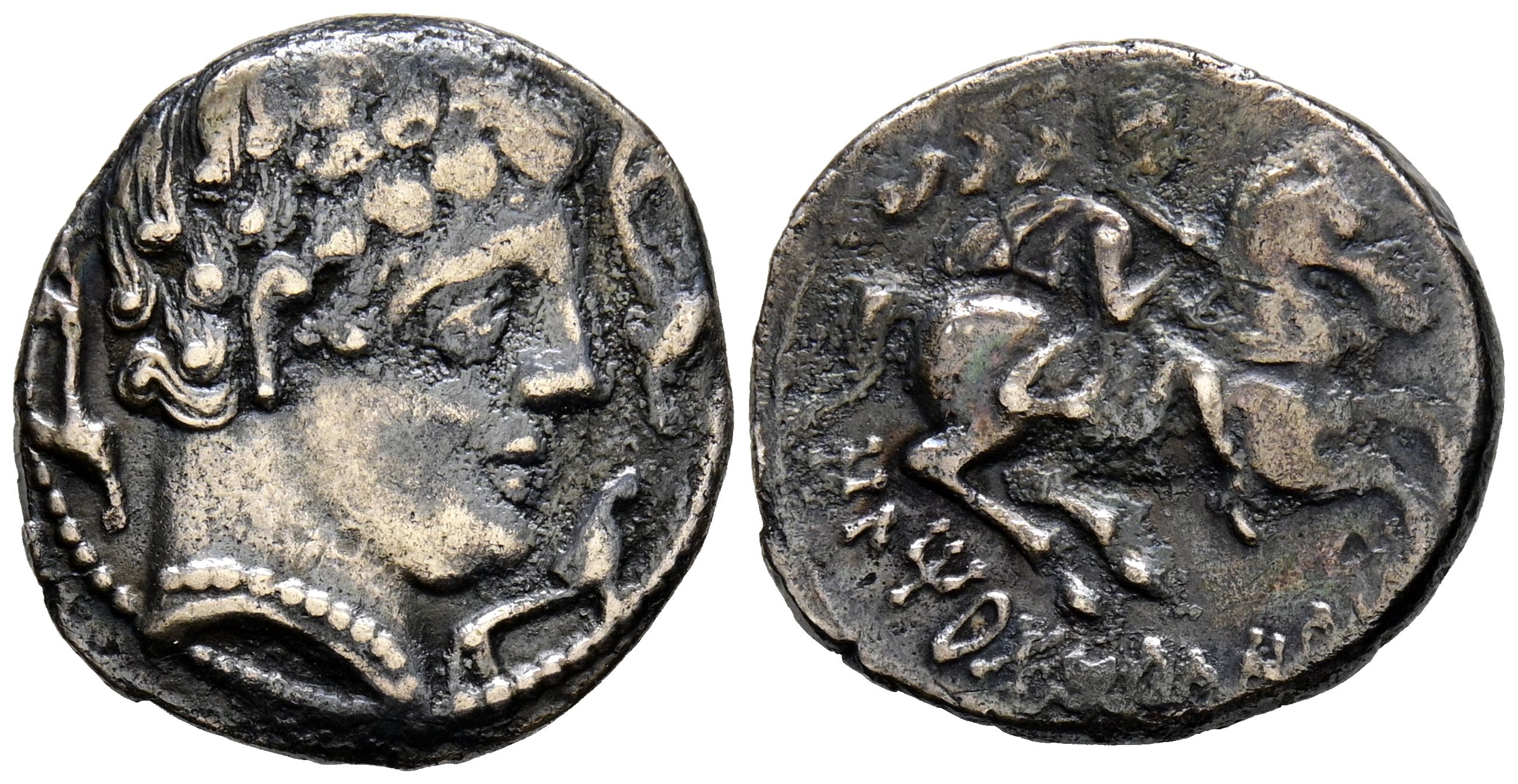 ILTIRTASALIRBAN (Lleida). Denarius. (Ar. 3.74g/18mm). 200-20 Fine (FAB-1455). Obv: Male head facing right surrounded by three dolphins. Reverse: Horseman with palm facing right, below Iberian legend: ILTiRTaSALIRBaN. VF-. Oxidations. Ex Aureo & Calicó, Auction 106 (27/05/1999), Lot No. 127.