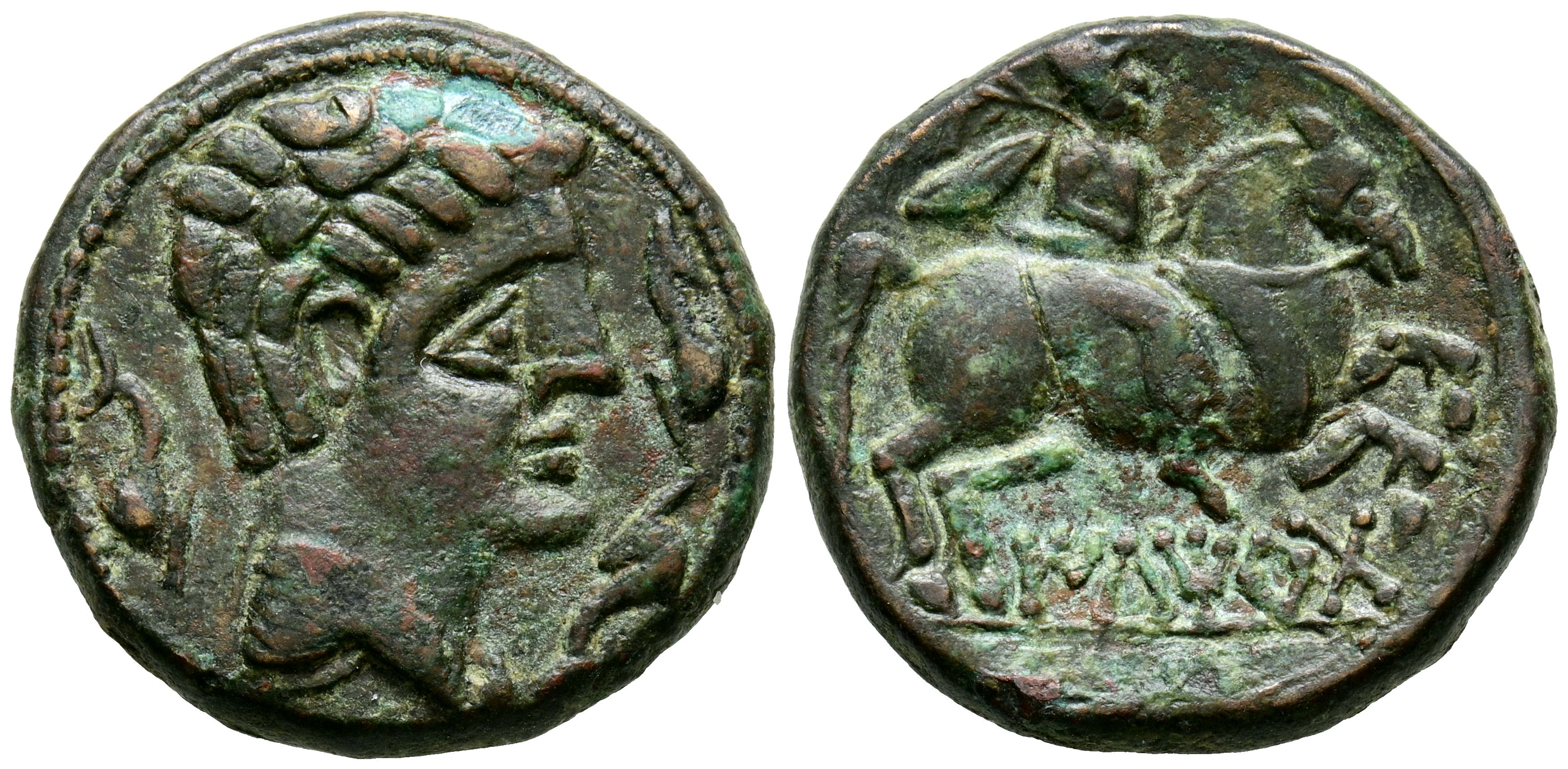 ILTIRTA (Lérida). As. (Ae. 10.37g/24mm). 200-20 Fine (FAB-1465). Obverse: Male head to the right, around three dolphins. Reverse: Horseman with palm to the right, below Iberian legend: ILTiRTa. VF+/VF. Oxidations on obverse.