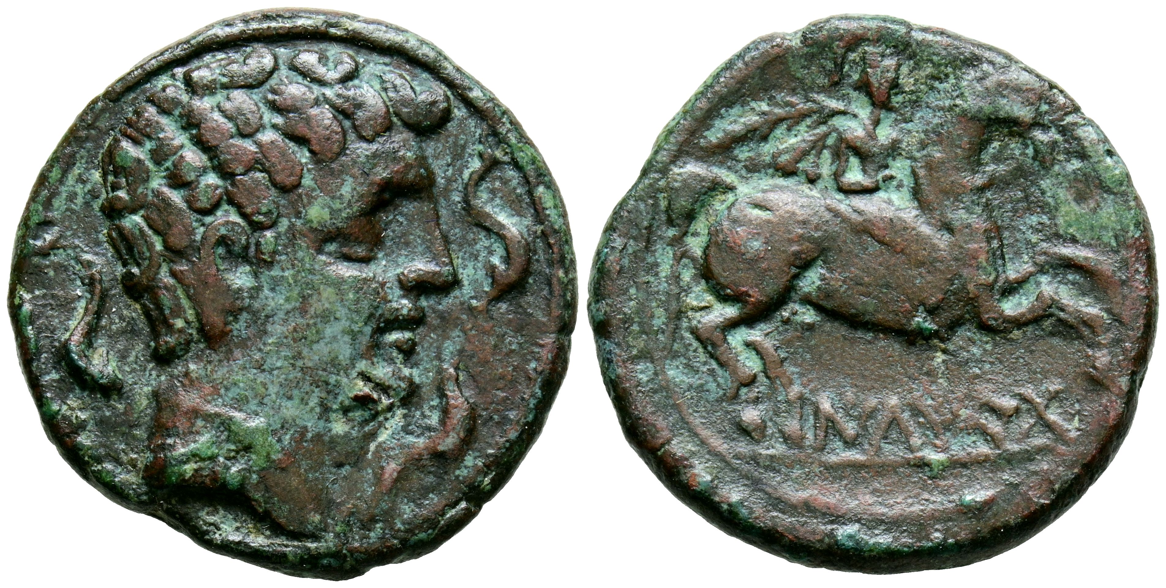 ILTIRTA (Lérida). As. (Ae. 11.39g/27mm). 200-20 Fine (FAB-1465). Anv: Male head right, around three dolphins. Reverse: Horseman with palm to the right, below Iberian legend: ILTiRTa. VF+.