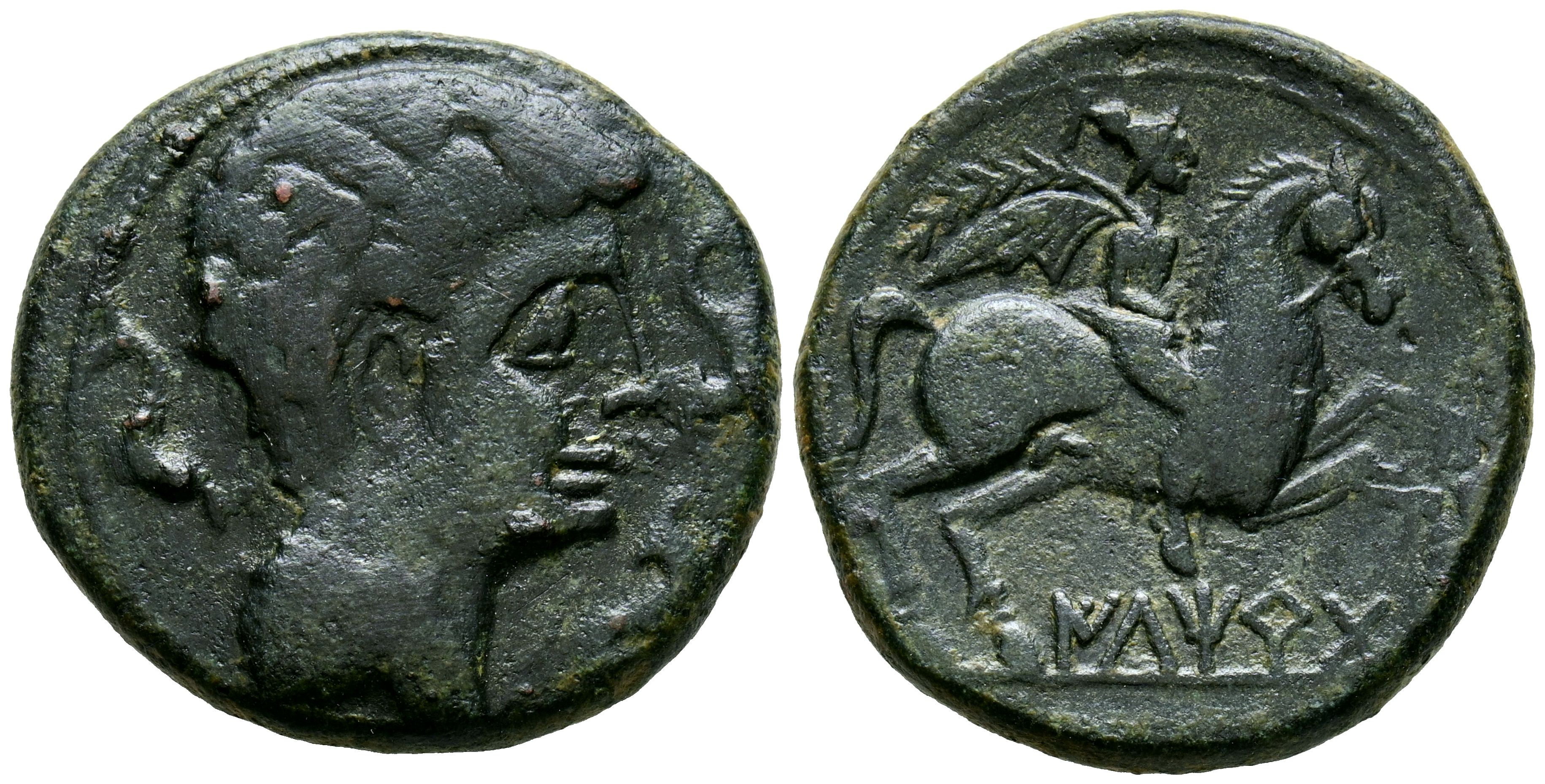 ILTIRTA (Lérida). As. (Ae. 11.65g/26mm). 200-20 Fine (FAB-1465). Anv: Male head to the right, around three dolphins. Reverse: Horseman with palm to the right, below Iberian legend: ILTiRTa. Very Fine-/Very Fine.