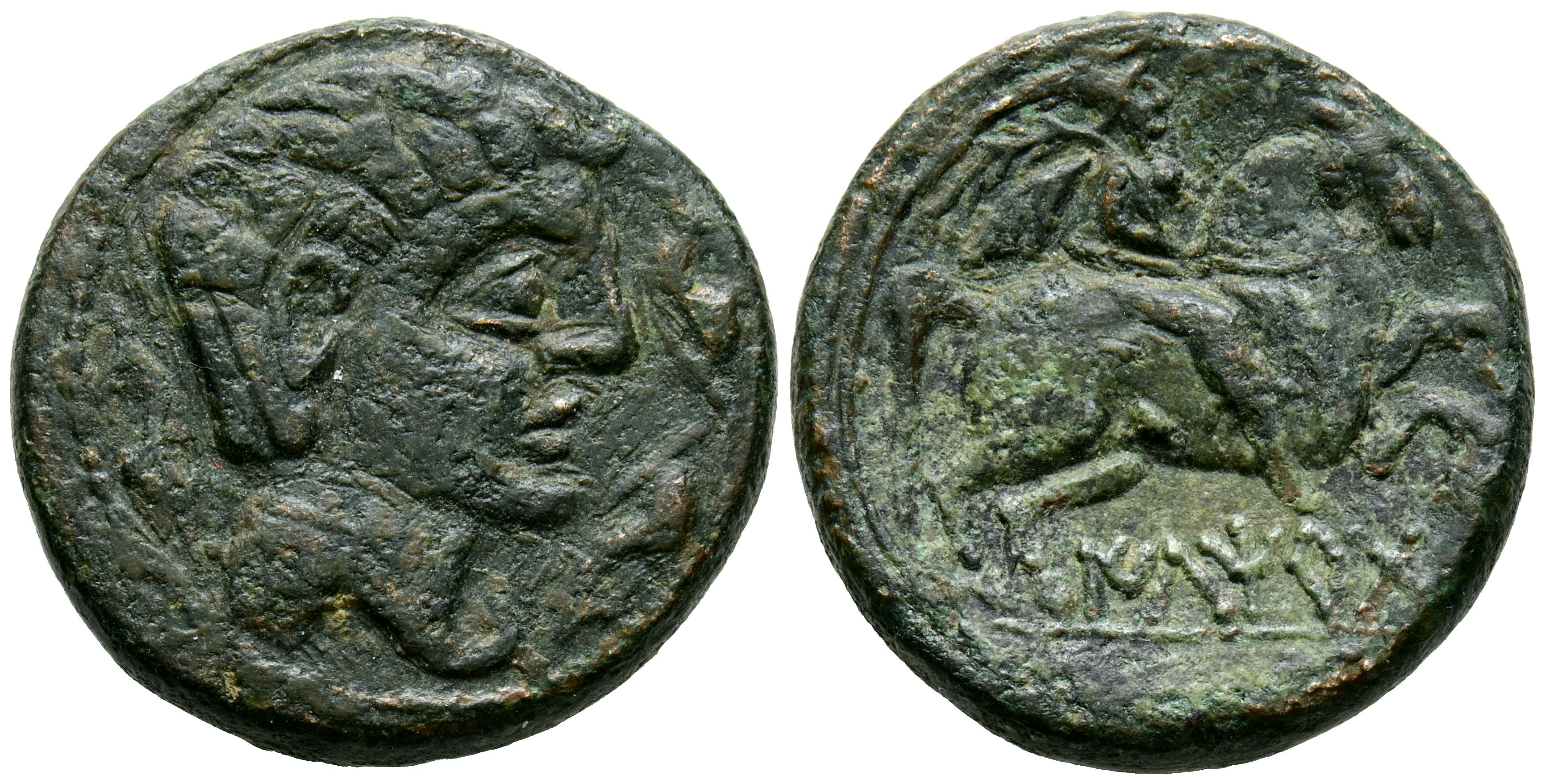 ILTIRTA (Lérida). As. (Ae. 10.78g/25mm). 200-20 Fine (FAB-1465). Anv: Male head to the right, around three dolphins. Reverse: Horseman with palm to the right, below Iberian legend: ILTiRTa. VF-.