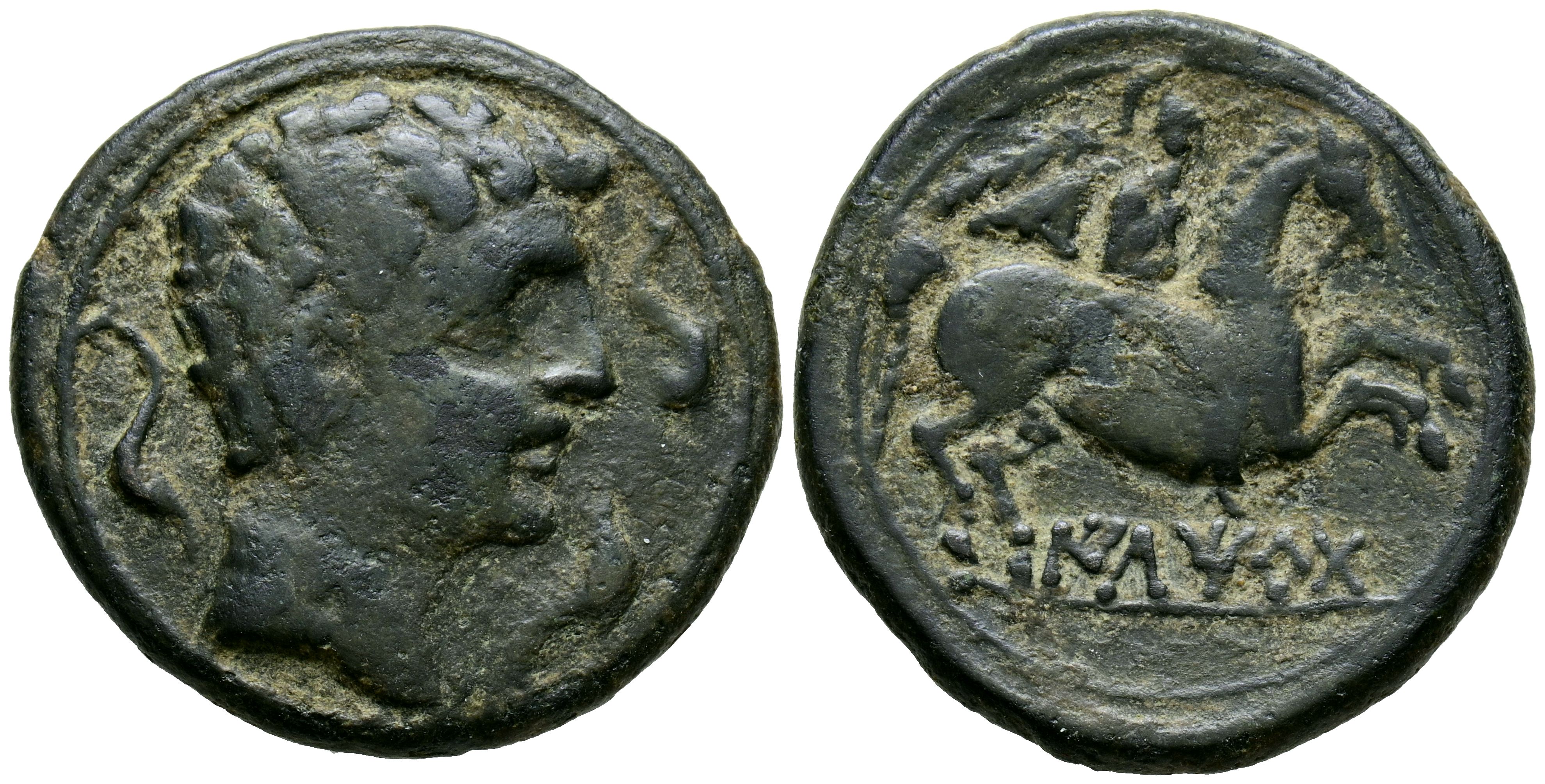 ILTIRTA (Lérida). As. (Ae. 12.56g/28mm). 200-20 Fine (FAB-1465). Anv: Male head right, around three dolphins. Reverse: Horseman with palm to the right, below Iberian legend: ILTiRTa. VF-.