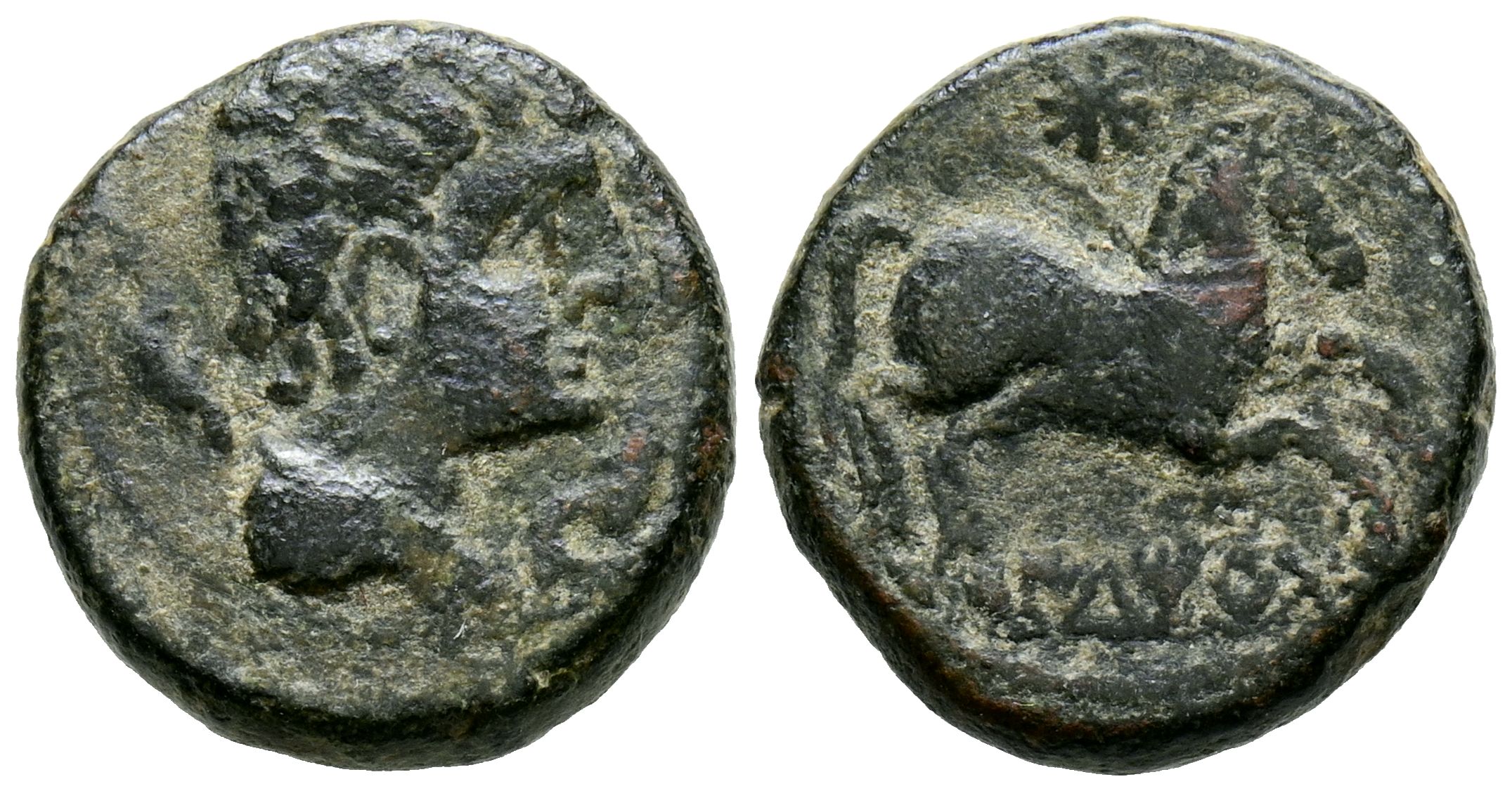 ILTIRTA (Lérida). Quadrant. (Ae. 3.68g/15mm). 200-20 Fine (FAB-1468). Obverse: Male head facing right surrounded by three dolphins. Reverse: Horse facing right, star above, legend below: ILTiRTa. VF.