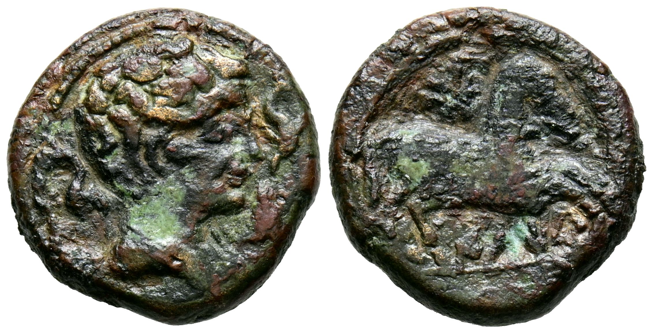 ILTIRTA (Lérida). Quadrant. (Ae. 2.80g/16mm). 200-20 Fine (FAB-1468). Obverse: Male head facing right surrounded by three dolphins. Reverse: Horse facing right, star above, legend below: ILTiRTa. Very Fine-.