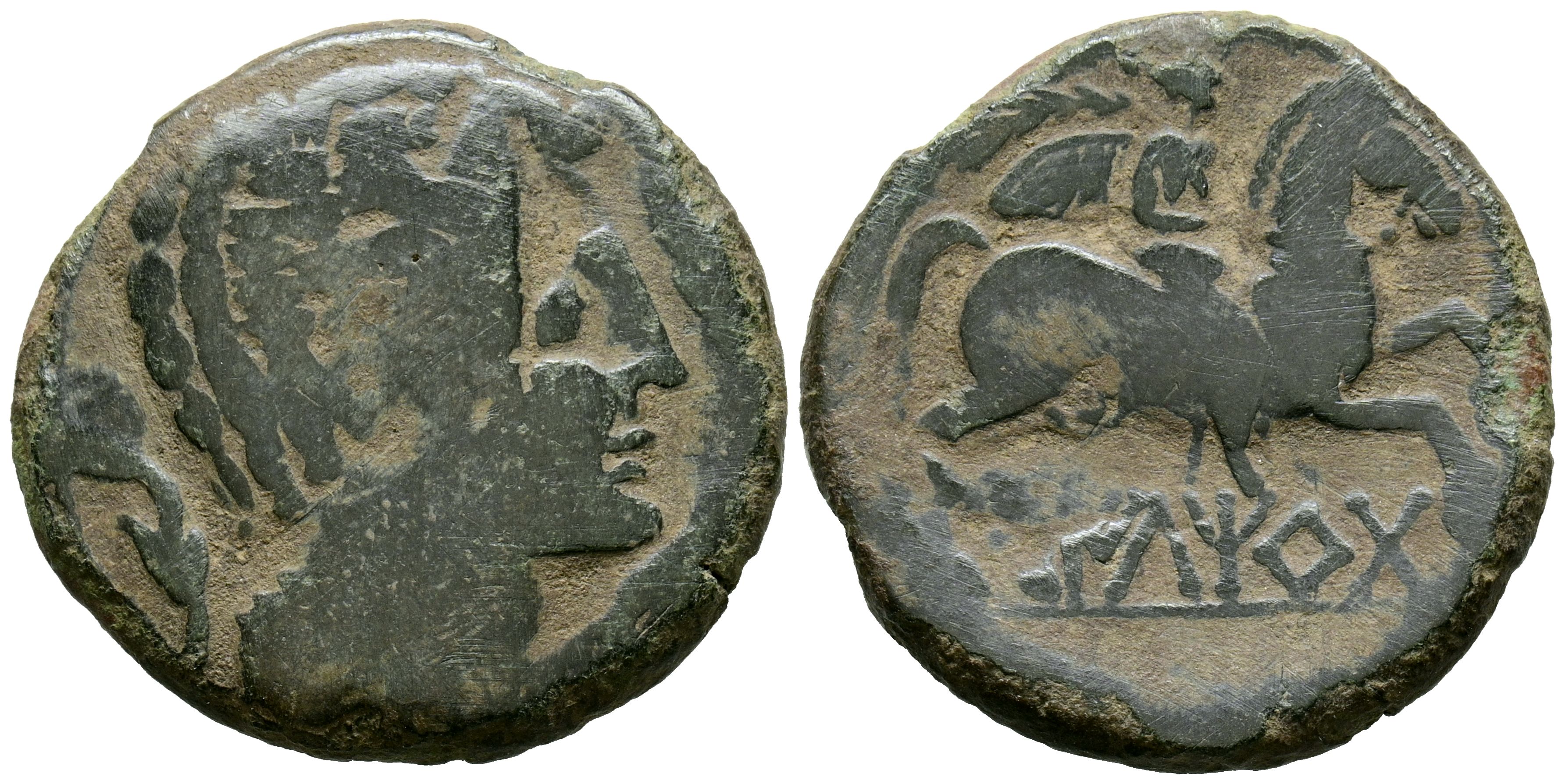 ILTIRTA (Lérida). As. (Ae. 8.59g/25mm). 200-20 Fine (FAB-1471). Anv: Male head to the right, around three dolphins. Rev: Horseman with palm to the right, below Iberian legend: ILTiRTa. Fine.