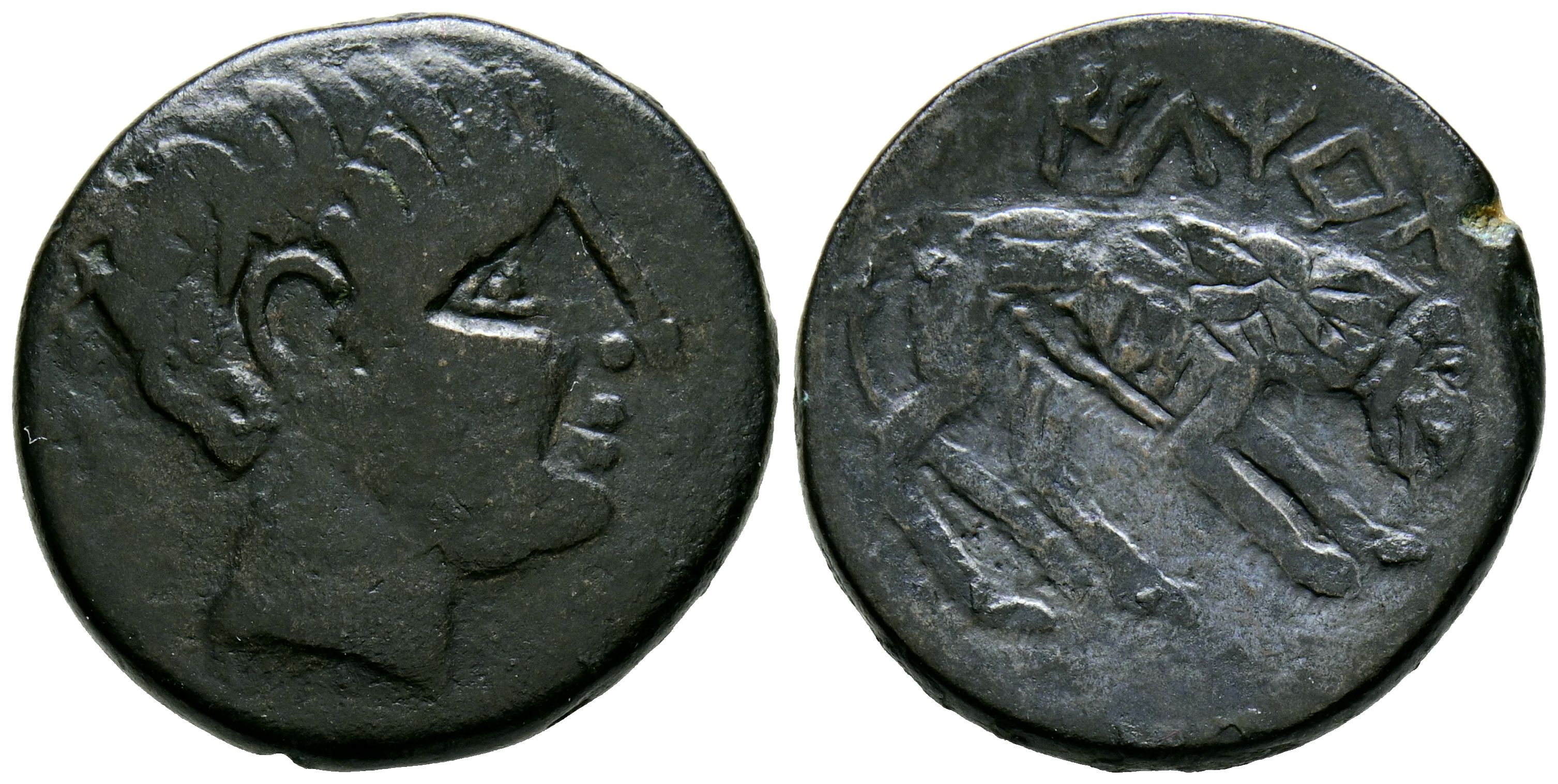 English ILTIRTA (Lérida). As. (Ae. 6.38g/21mm). 220-200 Fine (FAB-1477). Obverse: Male head to the right, degenerate art. Reverse: Wolf leaping to the right, above legend: ILTiRTa, degenerate art. VF-.