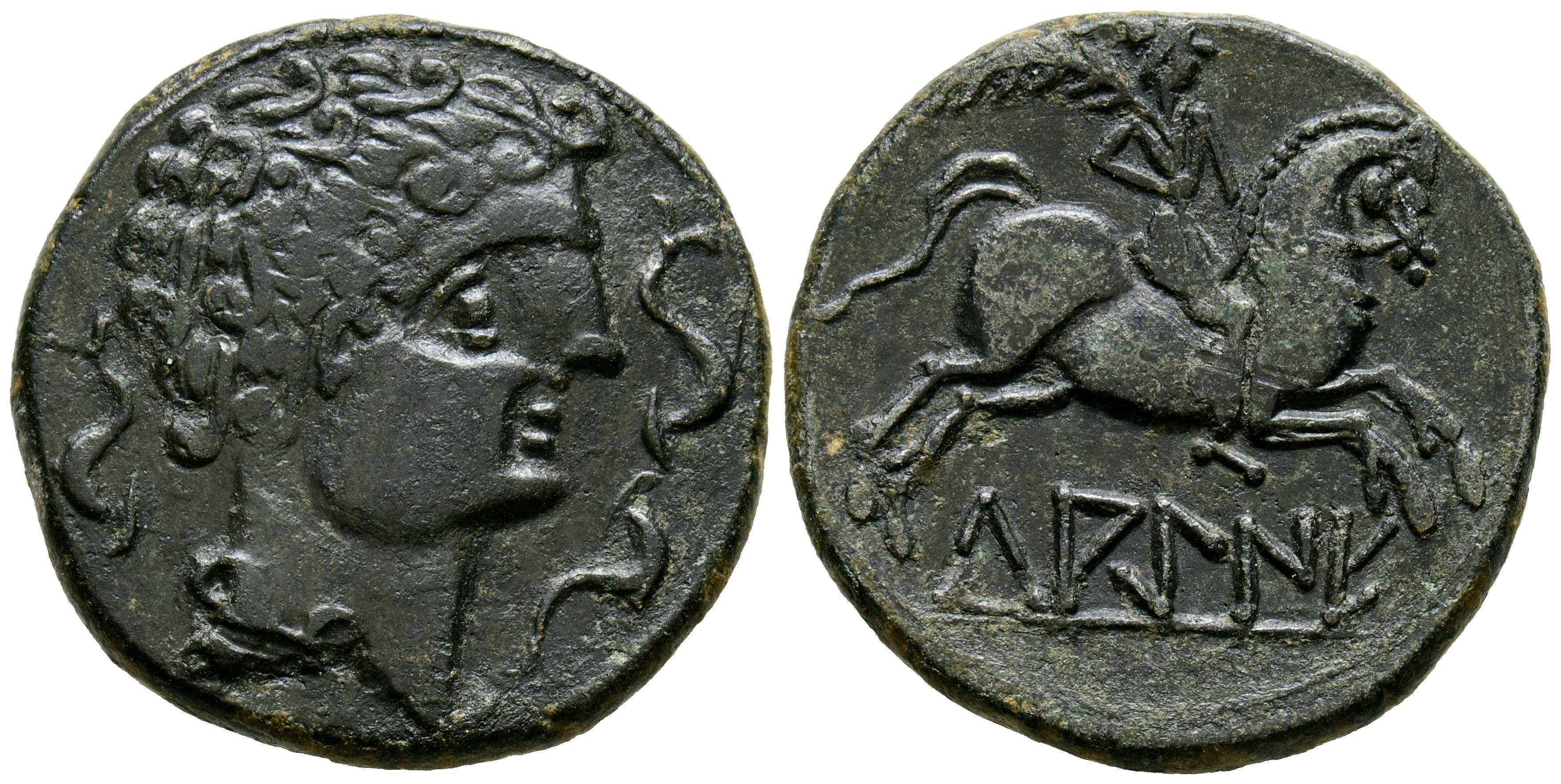 LAGINE (Aragon area). As. (Ae. 8.97g/24mm). 120-20 Fine (FAB-1656). Obv: Male head with ornaments to the right, around three dolphins. Reverse: Horseman with palm to the right, below Iberian legend on line: LAGiNE. VF+. Ex Aureo & Calicó, Auction 256 (03/12/2013), Lot No. 1324.