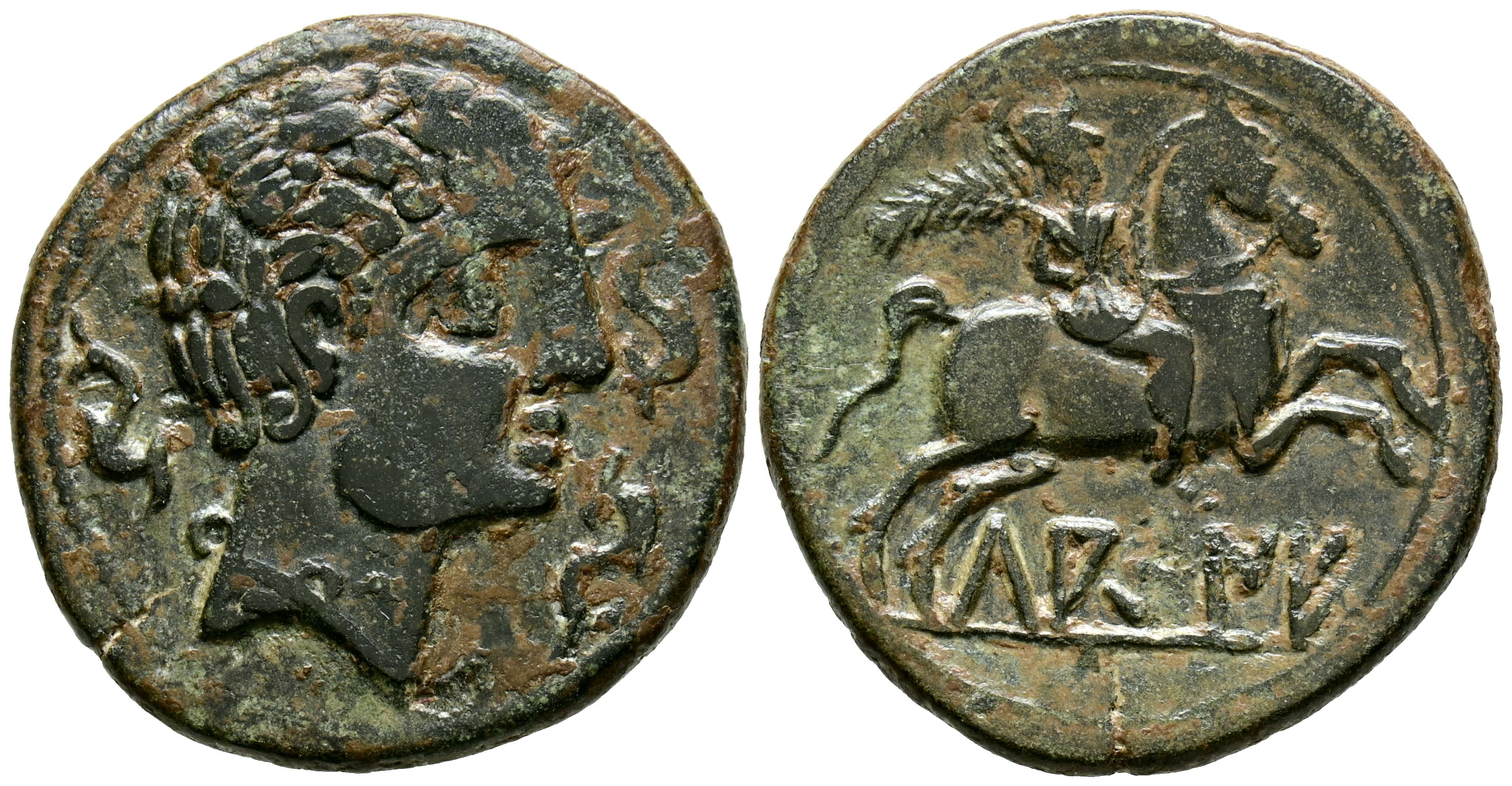 LAGINE (Aragon area). As. (Ae. 9.82g/27mm). 120-20 Fine (FAB-1656). Obv: Male head with ornaments to the right, around three dolphins. Reverse: Horseman with palm to the right, below Iberian legend on line: LAGiNE. VF+.