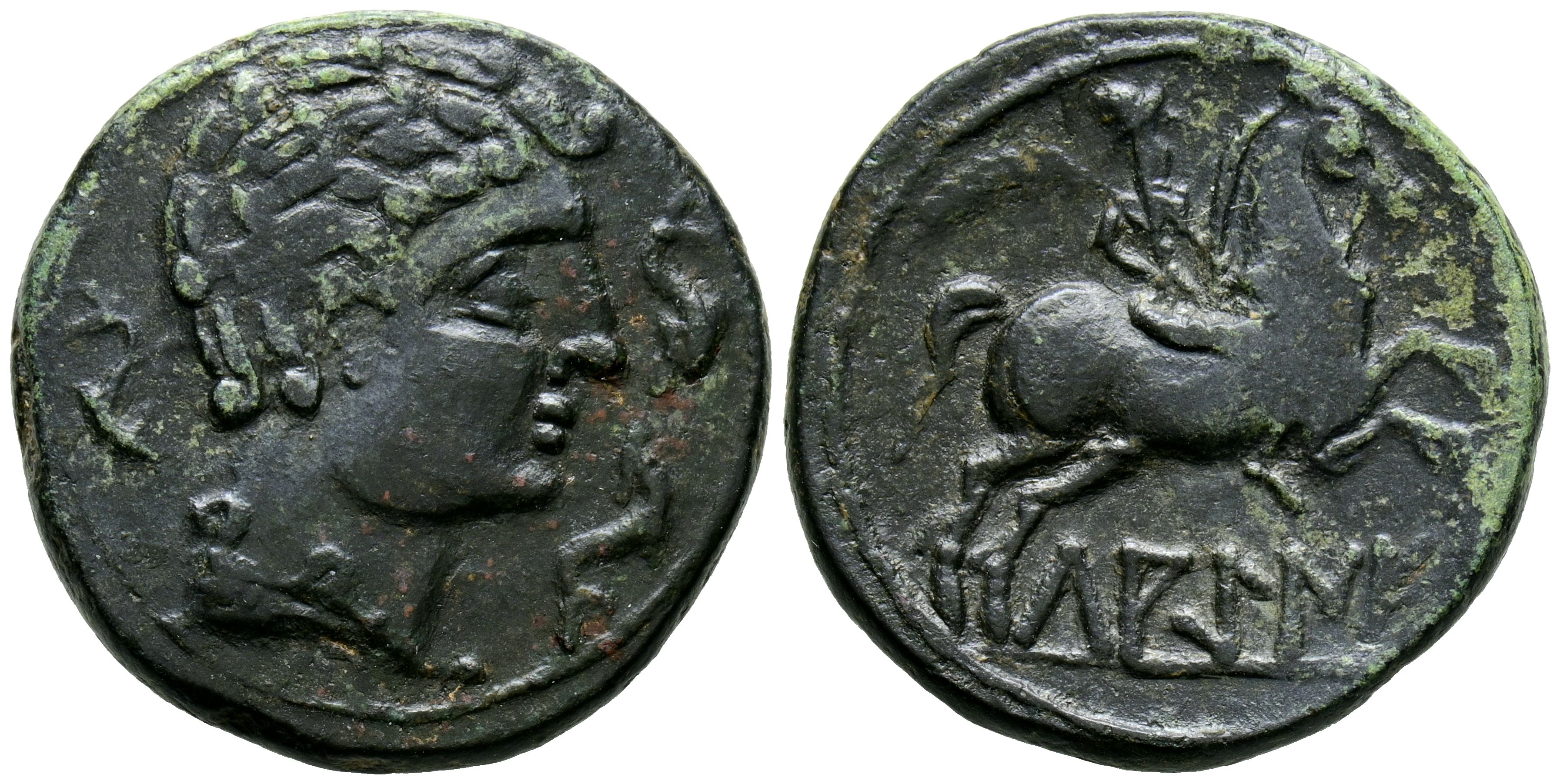 English LAGINE (Aragon area). As. (Ae. 10.16g/25mm). 120-20 Fine (FAB-1656). Obv: Male head with ornaments to the right, around three dolphins. Reverse: Horseman with palm to the right, below Iberian legend on line: LAGiNE. VF+.