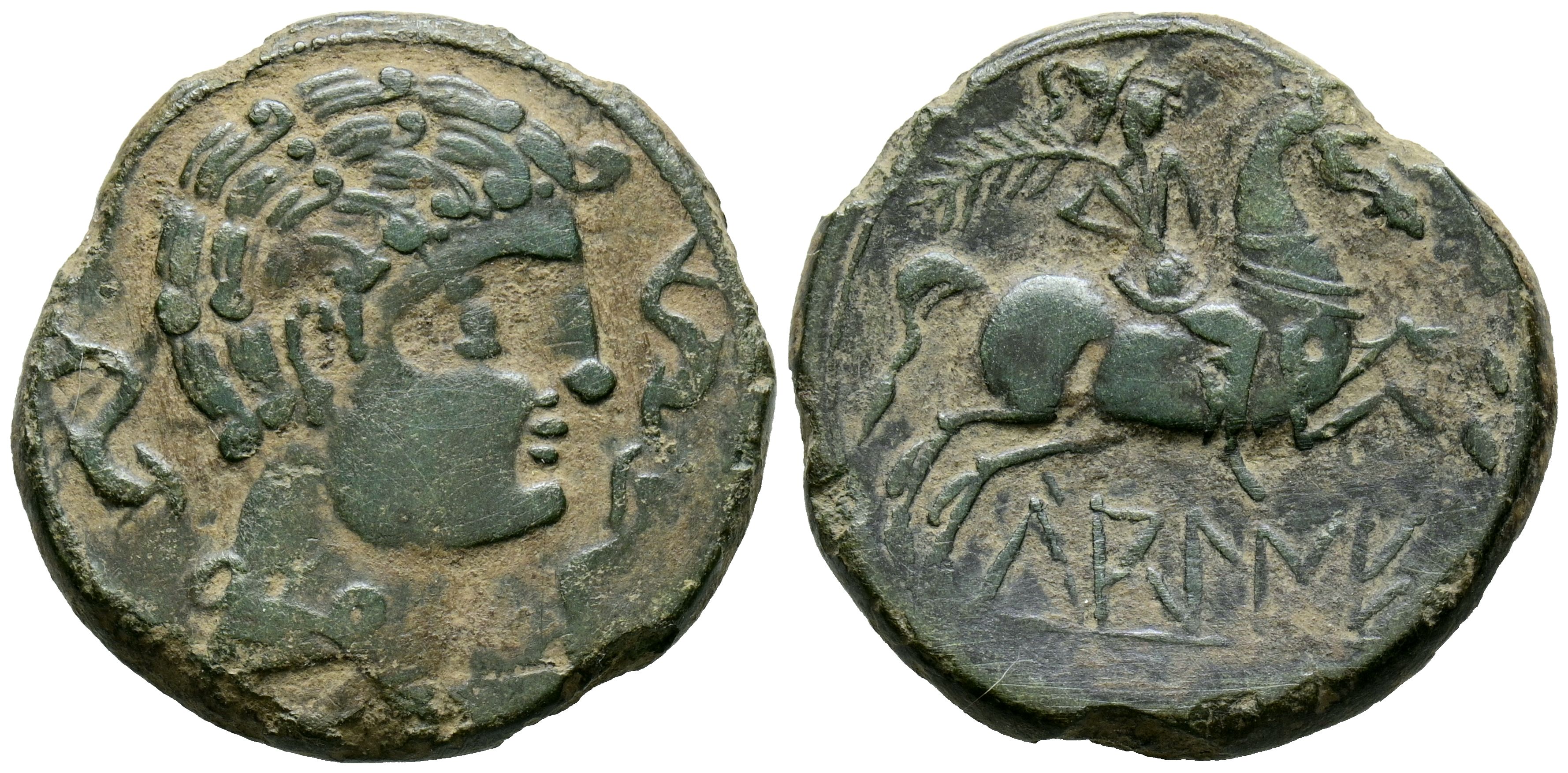LAGINE (Aragon area). As. (Ae. 8.36g/25mm). 120-20 Fine (FAB-1656). Anv: Male head with ornaments to the right, around three dolphins. Reverse: Horseman with palm to the right, below Iberian legend on line: LAGiNE. VF.
