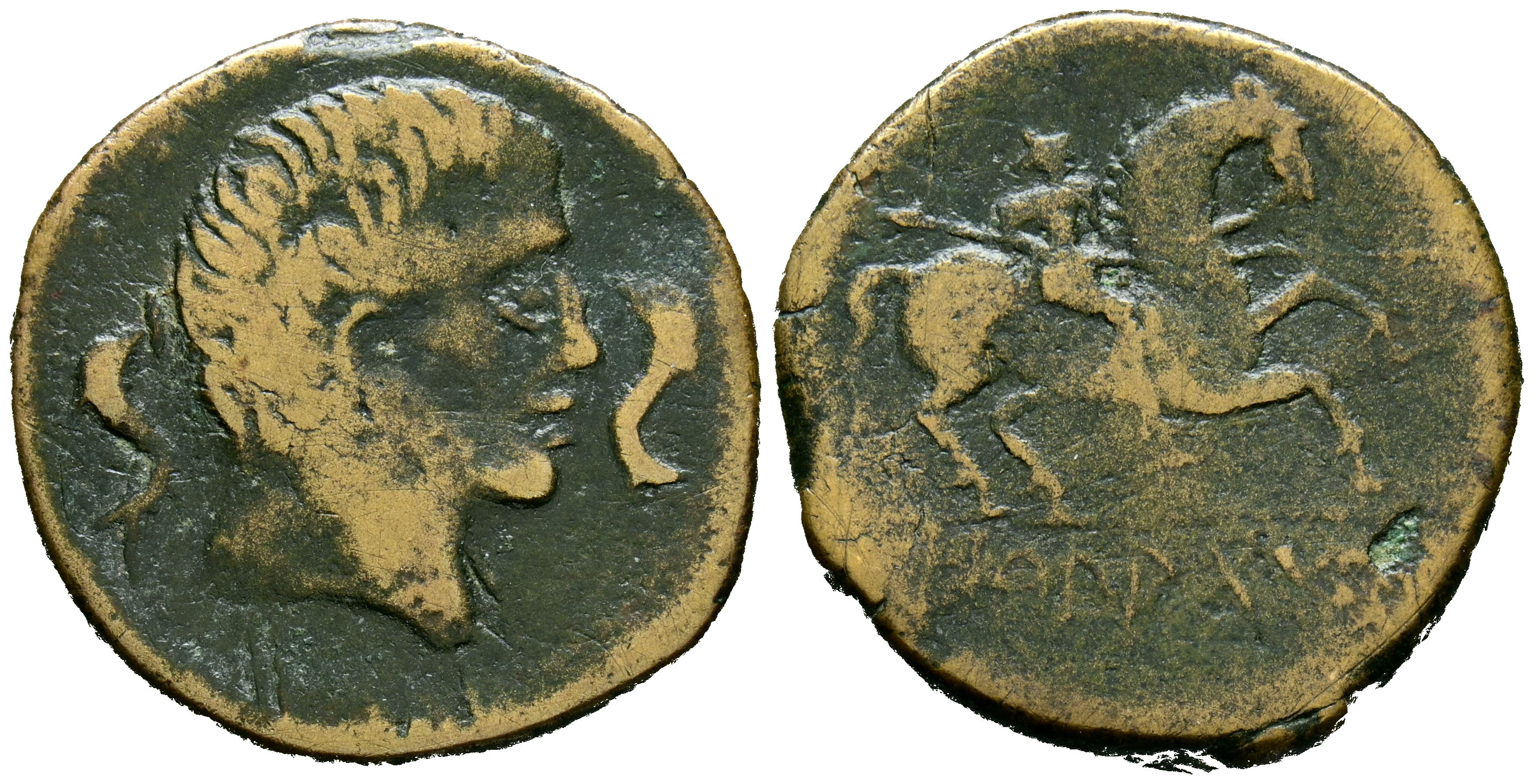 OCALACOM (Possibly Oncala, Soria). As. (Ae. 9.17g/26mm). 120-20 Fine (FAB-1859; ACIP 1863). Obv: Male head right between two dolphins. Rev: Horseman with lance right, below Iberian legend below line: OCaLACoM. Good Fine. Scarce specimen.