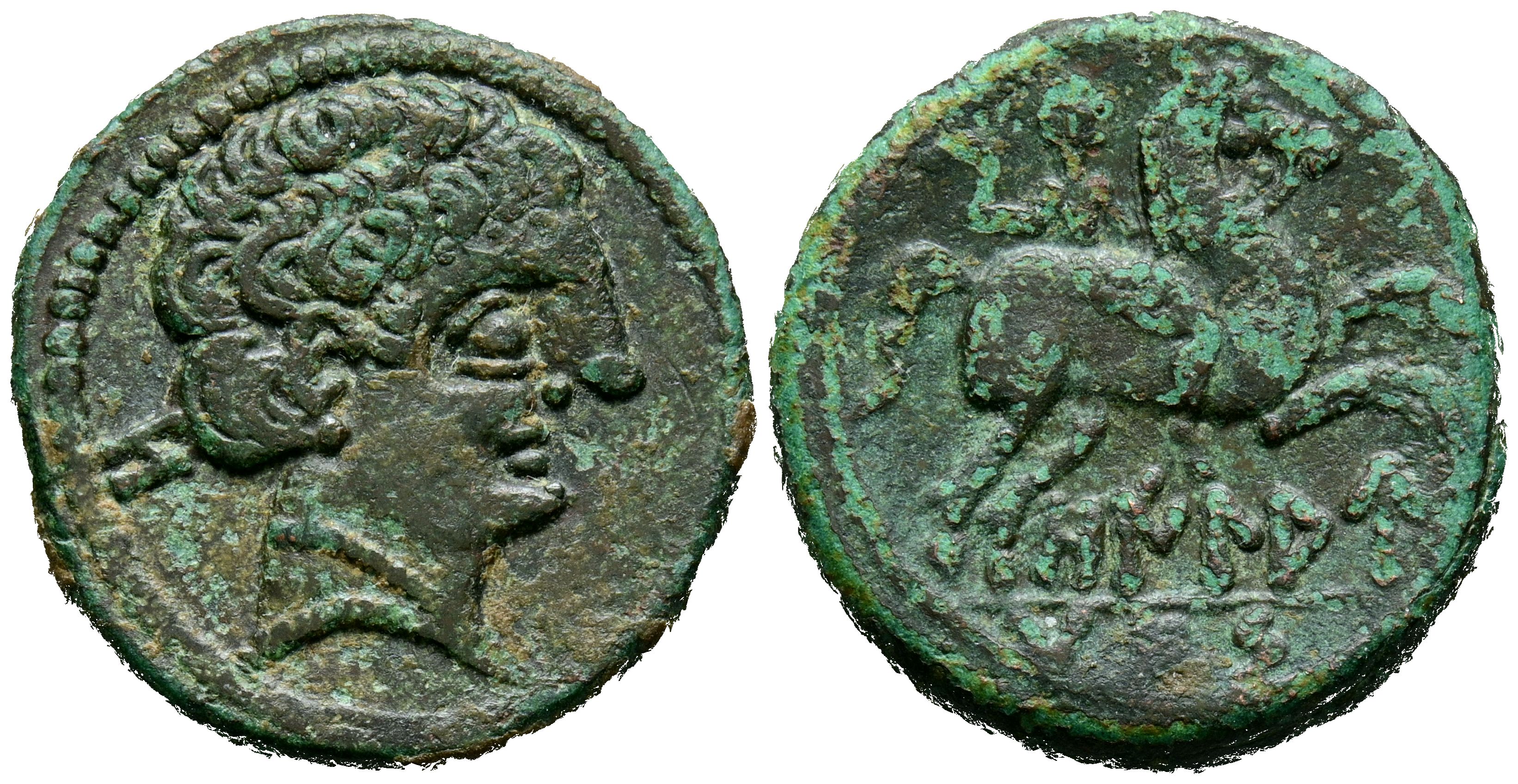 OILAUNES (Northern Ebro area). As. (Ae. 9.53g/24mm). 120-20 Fine (FAB-1868). Anv: Male head to the right, behind Iberian letter: O. Rev: Horseman with hook to the right, below Iberian legend divided by line: OIAU/NES. Good Very Fine/Very Fine.