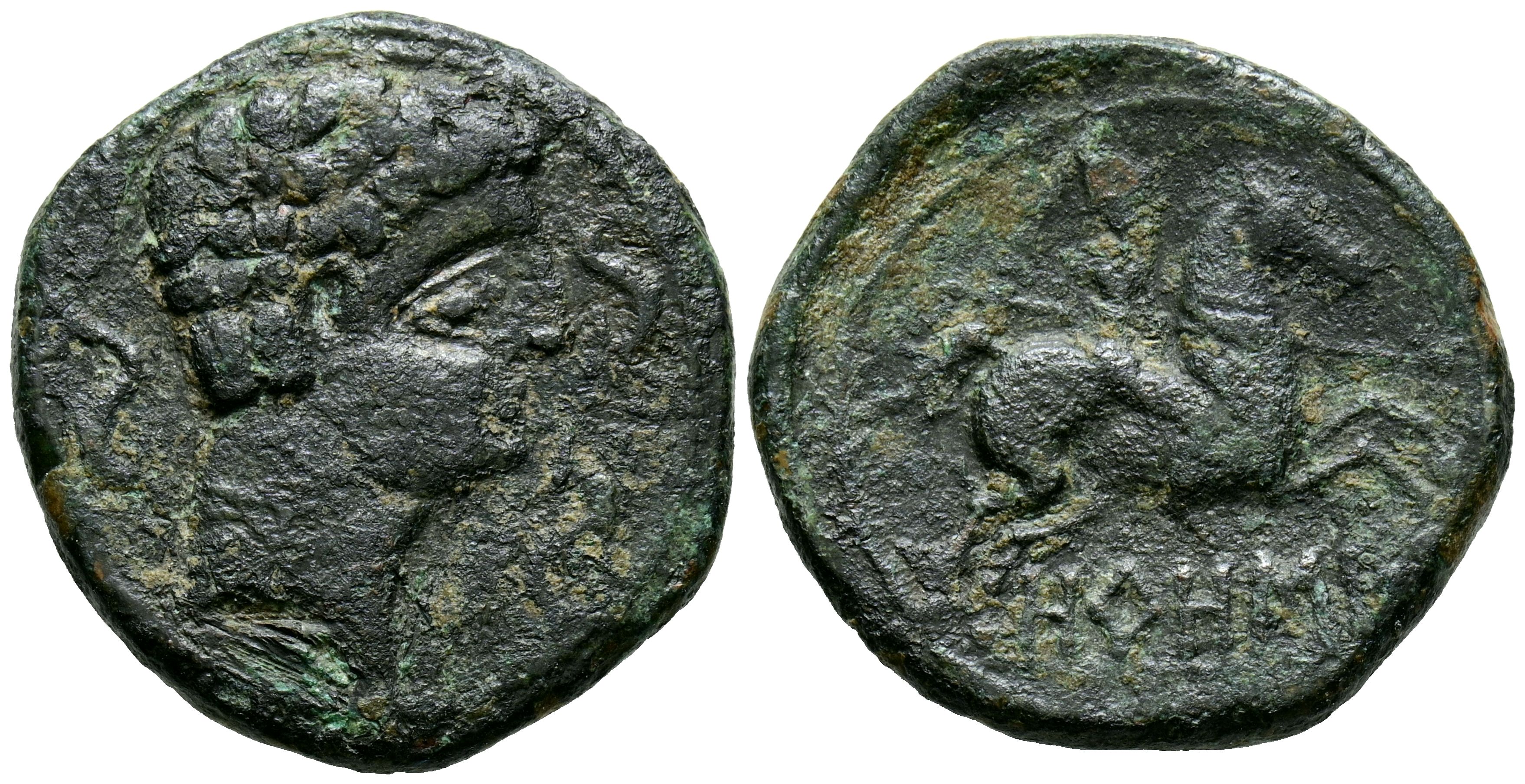 OROSIS (Ores, Zaragoza). As. (Ae. 8.40g/25mm). 120-20 Fine (FAB-1907). Anv: Bearded male head right, between three dolphins. Rev: Horseman with lance right, below Iberian legend: OROSIS. Good Fine.