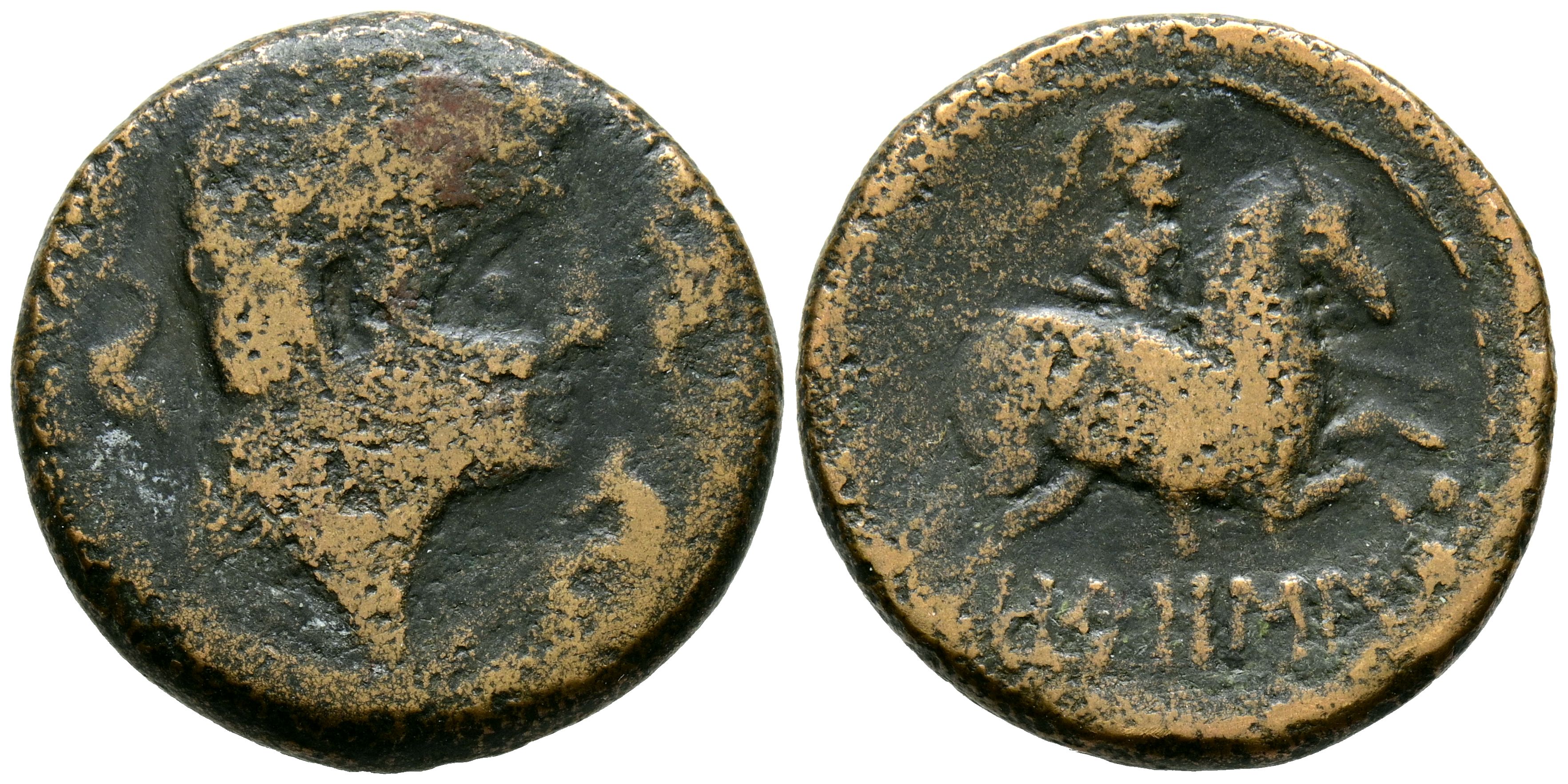 OROSIS (Ores, Zaragoza). As. (Ae. 10.15g/24mm). 120-20 Fine (FAB-1907). Anv: Bearded male head right, between three dolphins. Rev: Horseman with lance right, below Iberian legend: OROSIS. Fine.