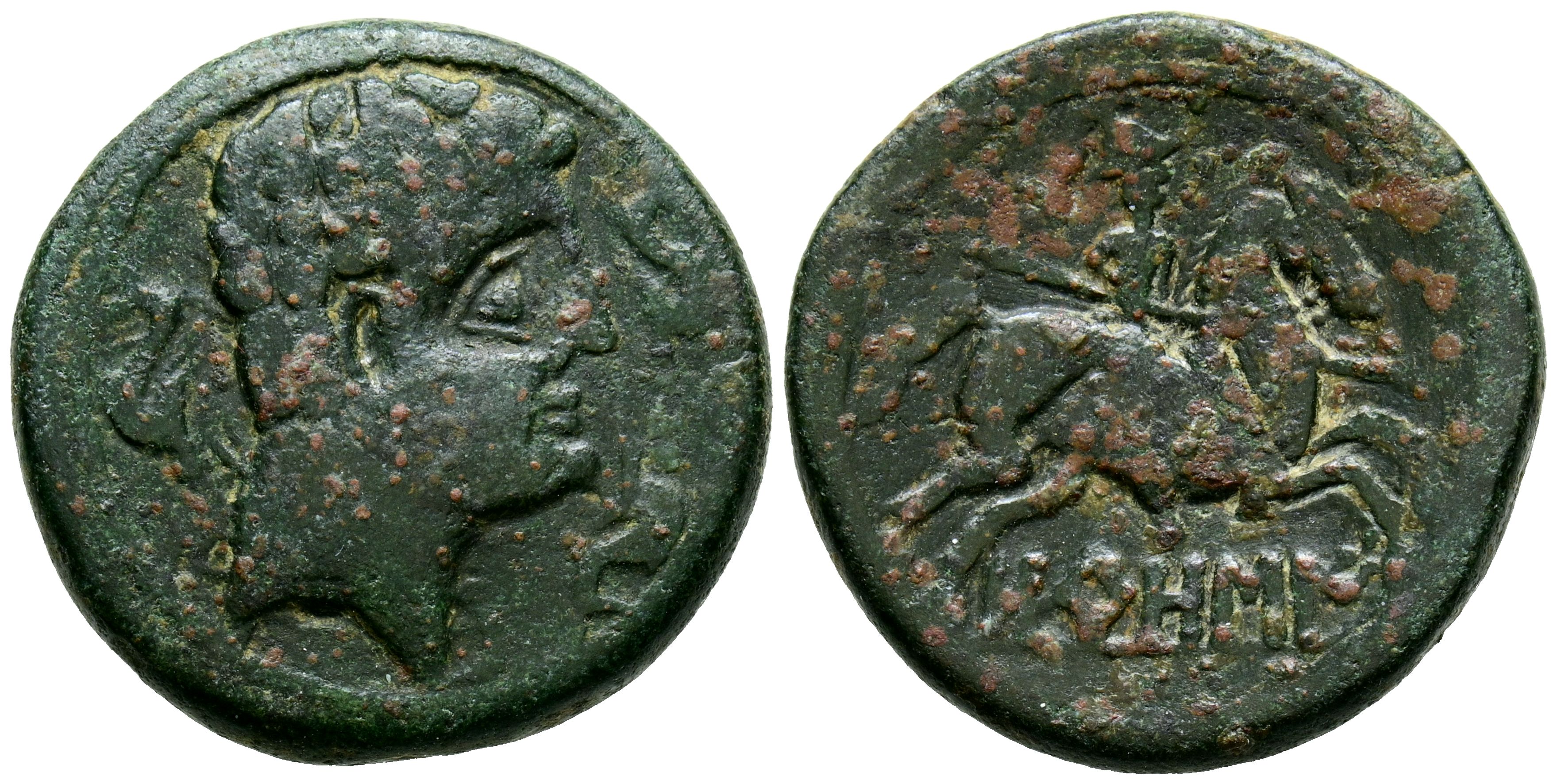 OROSIS (Ores, Zaragoza). As. (Ae. 10.70g/25mm). 120-20 Fine (FAB-1907). Anv: Bearded male head right, between three dolphins. Rev: Horseman with lance right, below Iberian legend: OROSIS. VF-.