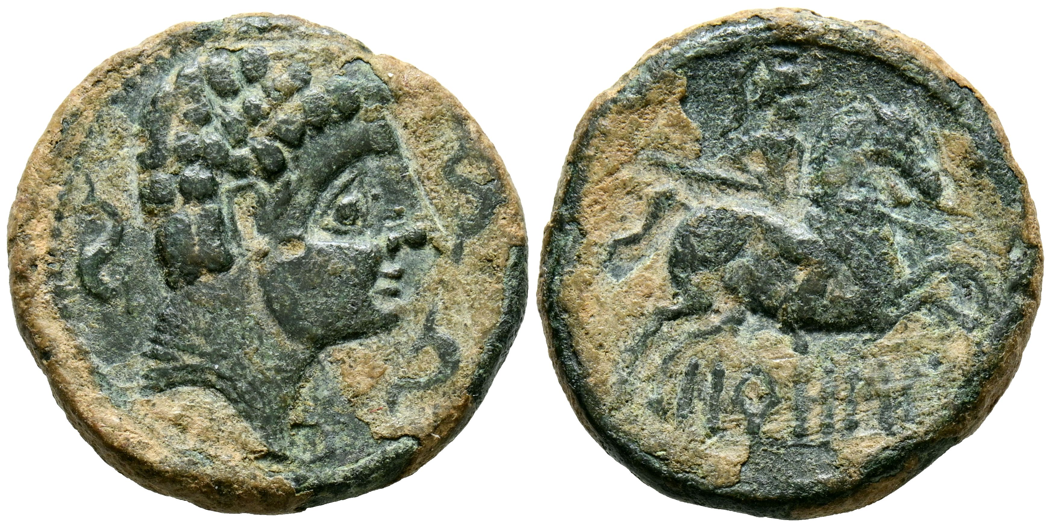 OROSIS (Ores, Zaragoza). As. (Ae. 9.28g/25mm). 120-20 Fine (FAB-1908). Anv: Bearded male head right, between three dolphins, with ornaments on the neck. Rev: Horseman with lance right, below Iberian legend: OROSIS. VF-.