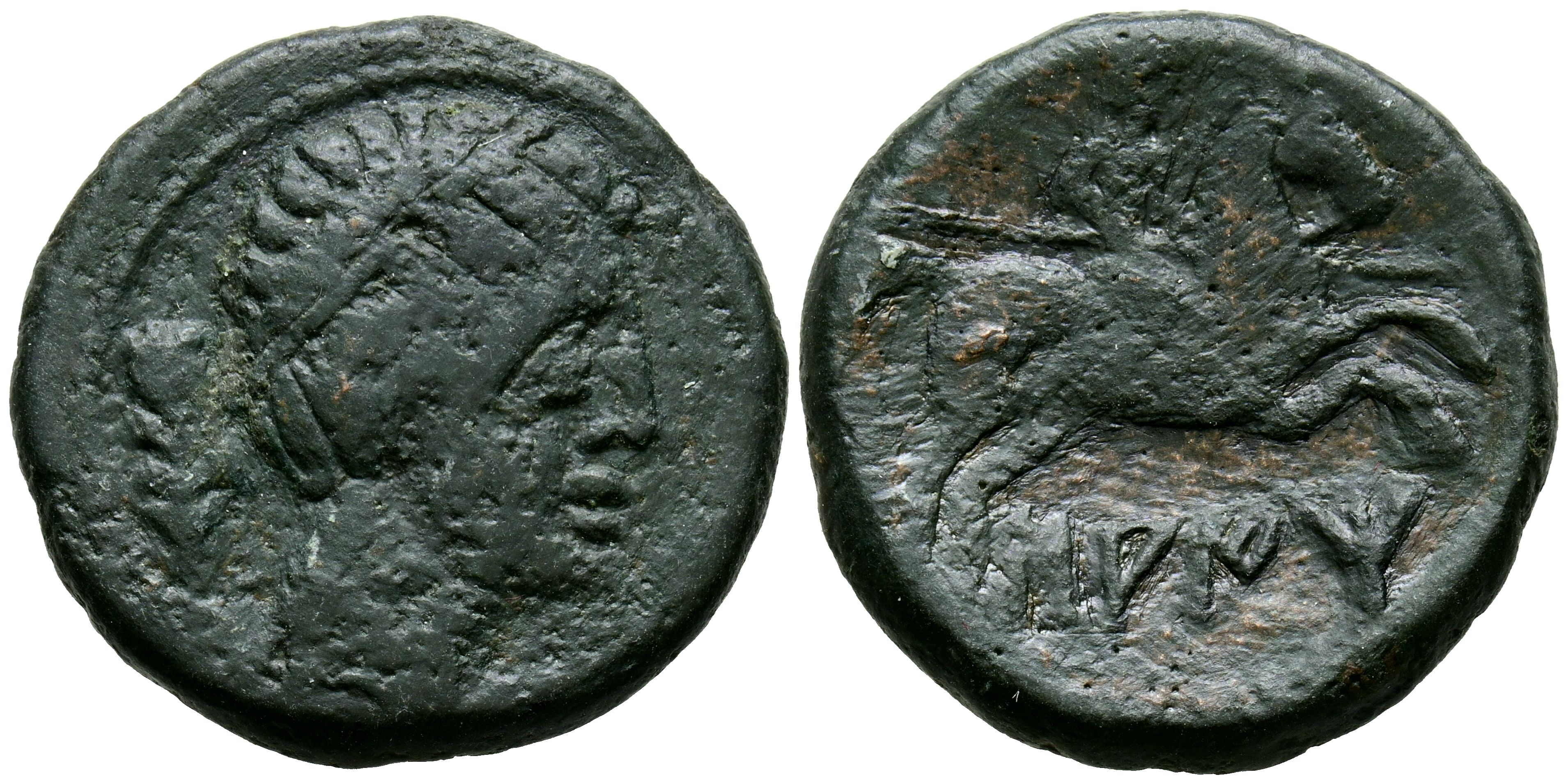 SAITI (Xátiva, Valencia). As. (Ae. 12.17g/27mm). 120-20 Fine (FAB-2100). Anv: Diademed male head to right, palm behind. Rev: Horseman with lance to right, below Iberian legend: SAITi. VF-.