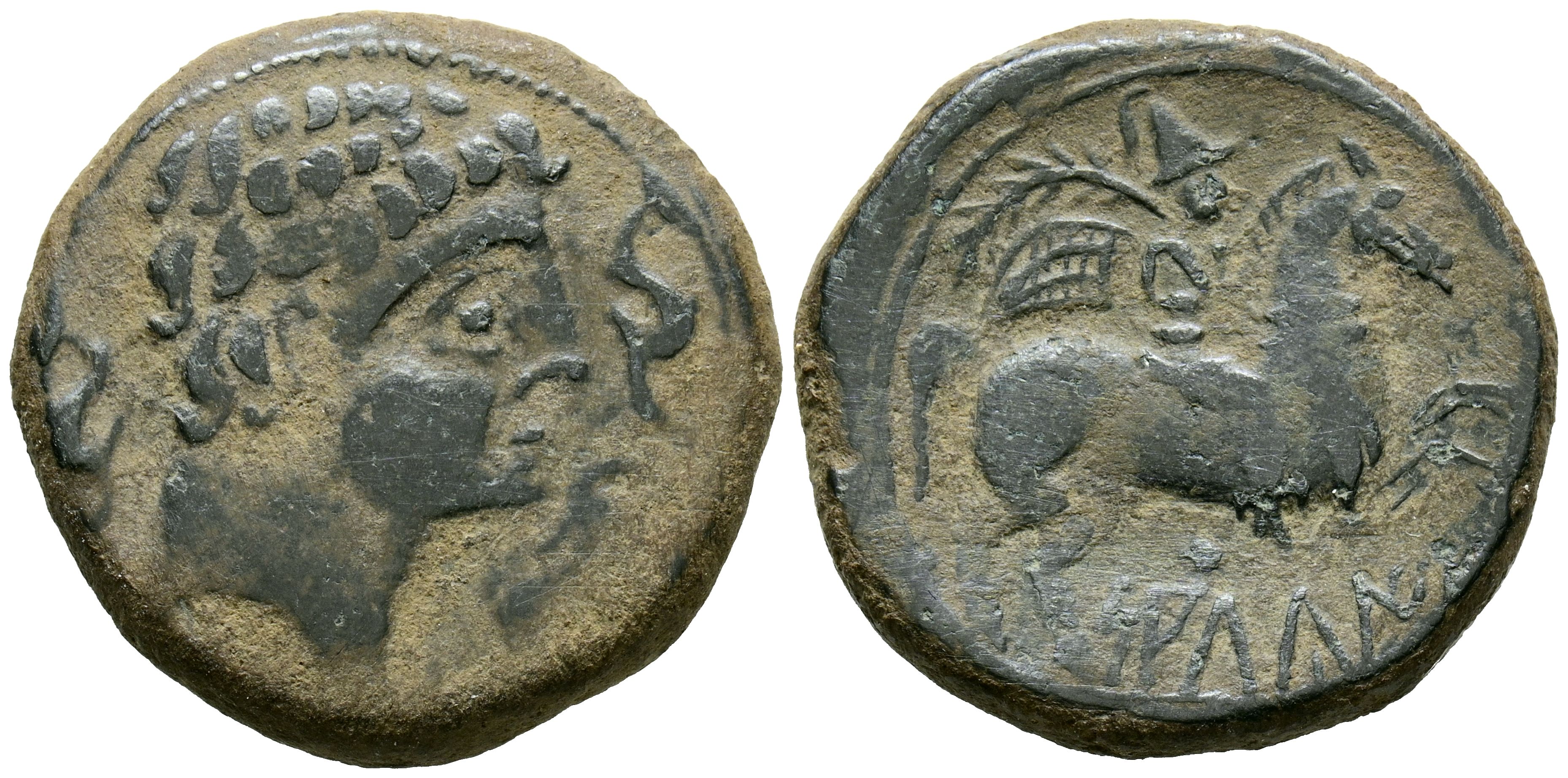 English SALDUIE (Zaragoza). As. (Ae. 11.61g/26mm). 120-30 Fine (FAB-305). Anv: Male head surrounded by three dolphins on the right. Rev: Horseman with palm and chlamys on the right, below Iberian legend: SALDuIE. VF.