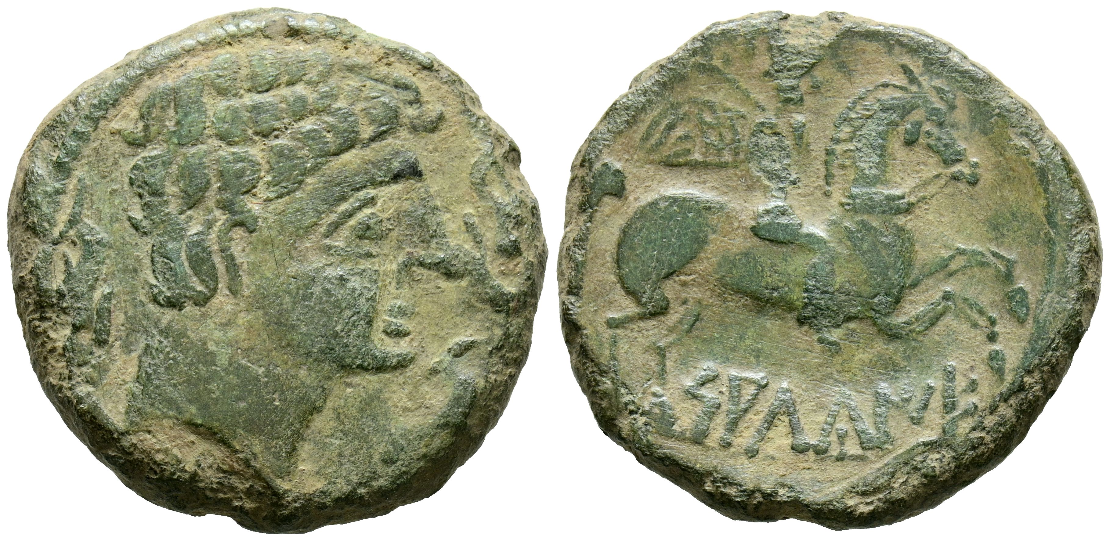 English SALDUIE (Zaragoza). As. (Ae. 9.29g/26mm). 120-30 Fine (FAB-305). Anv: Male head surrounded by three dolphins on the right. Rev: Horseman with palm and chlamys on the right, below Iberian legend: SALuIO. Very Fine-. Green patina.
