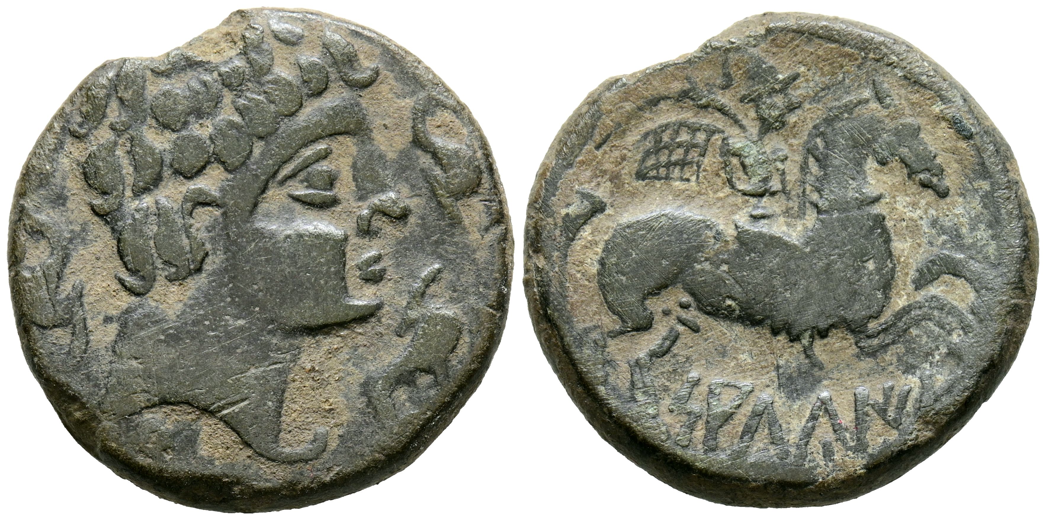 SALDUIE (Zaragoza). As. (Ae. 7.40g/24mm). 120-30 Fine (FAB-305). Anv: Male head surrounded by three dolphins on the right. Rev: Horseman with palm and chlamys on the right, below Iberian legend: SALDuIE. VF-.