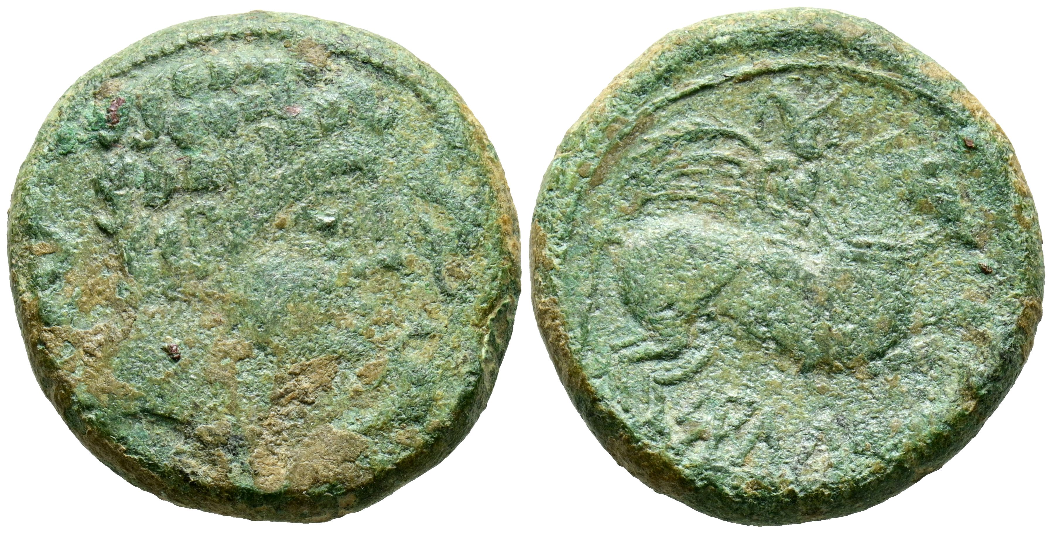 SALDUIE (Zaragoza). As. (Ae. 13.74g/26mm). 120-30 Fine (FAB-305). Anv: Male head surrounded by three dolphins on the right. Rev: Horseman with palm and chlamys on the right, below Iberian legend: SALuIO. Very Fine-.
