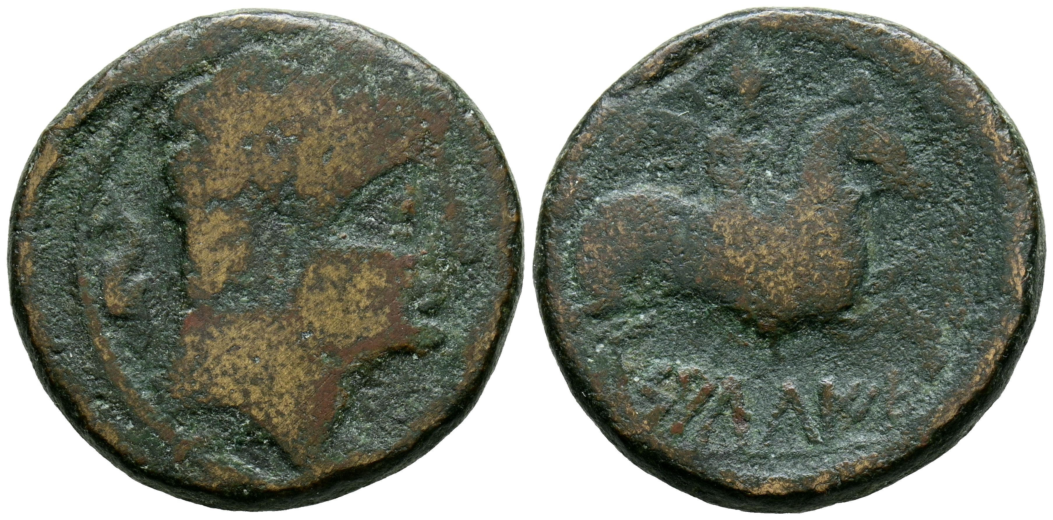SALDUIE (Zaragoza). As. (Ae. 11.34g/26mm). 120-30 Fine (FAB-305). Anv: Male head surrounded by three dolphins on the right. Rev: Horseman with palm and chlamys on the right, below Iberian legend: SALuIO. Good Fine.