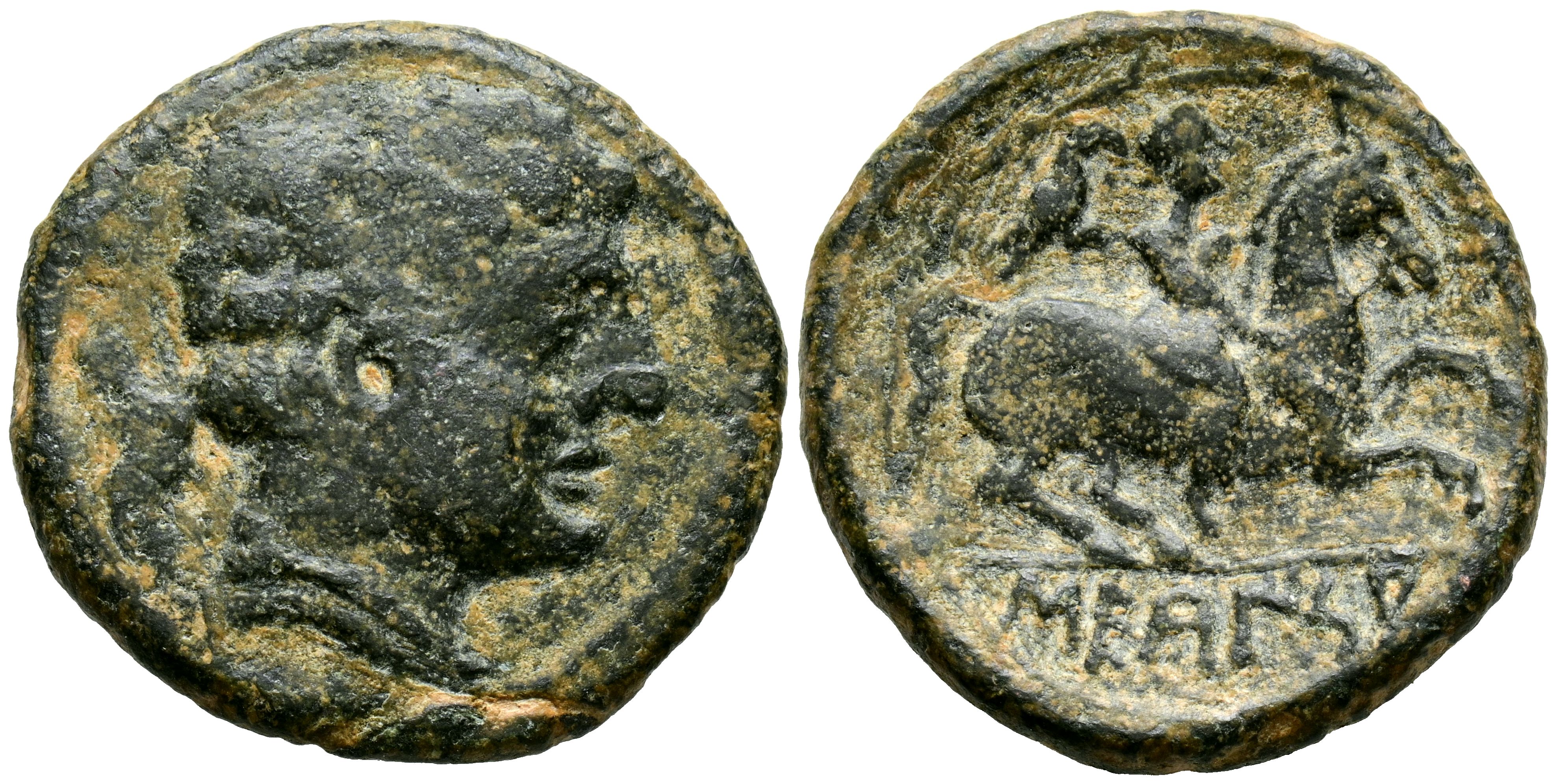 SECAISA (Segeda, Zaragoza). As. (Ae. 11.63g/28mm). 120-20 Fine (FAB-2129). Obv: Male head right, lion behind. Rev: Horseman with banner with eagle right, below Iberian legend: SECaISA. Good Fine. Scarce.