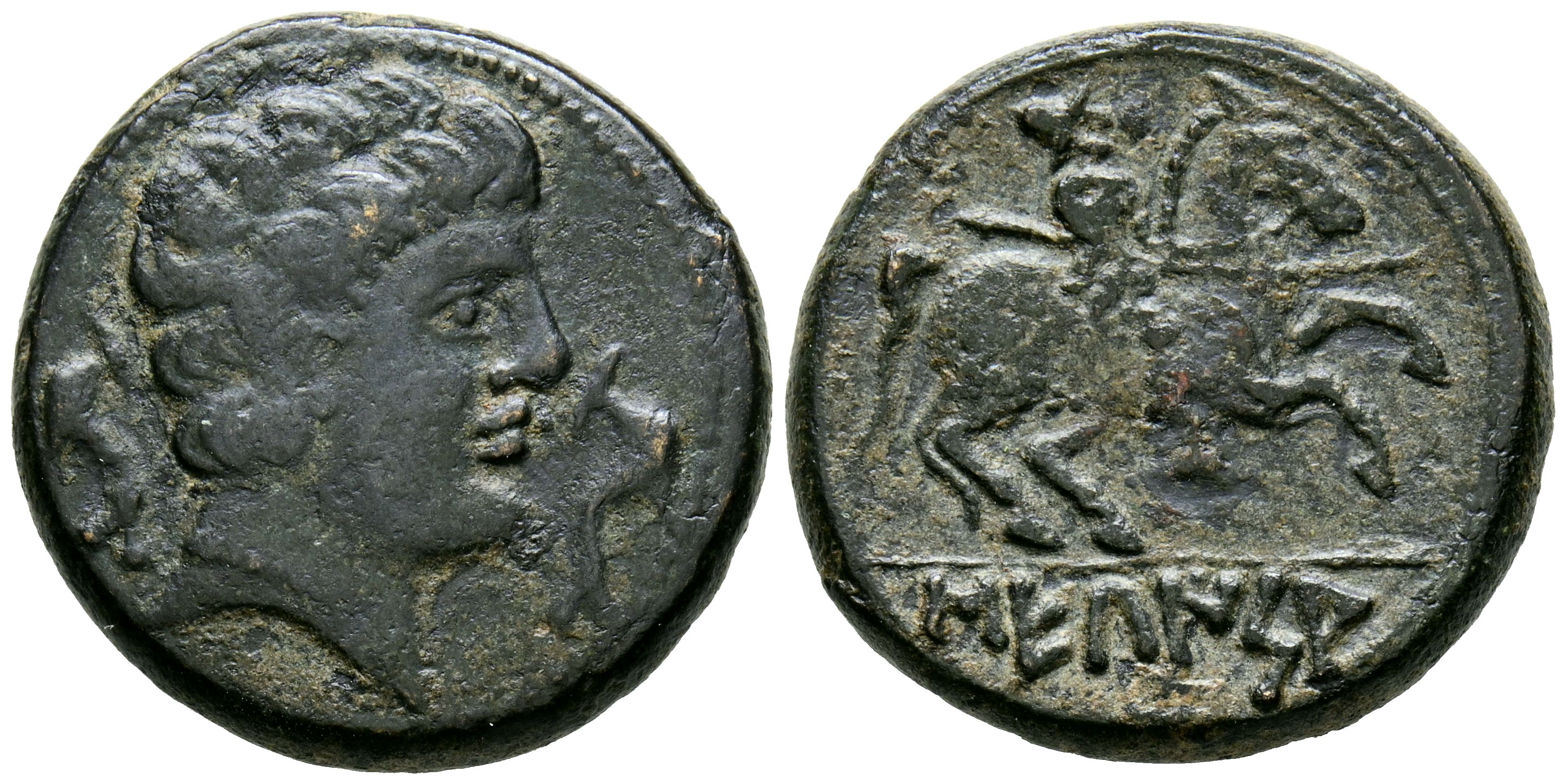 SECAISA (Segeda, Zaragoza). As. (Ae. 10.16g/24mm). 120-20 Fine (FAB-2131). Anv: Male head to the right, between two dolphins. Rev: Horseman with lance to the right, below Iberian legend: SECaISA. VF-.