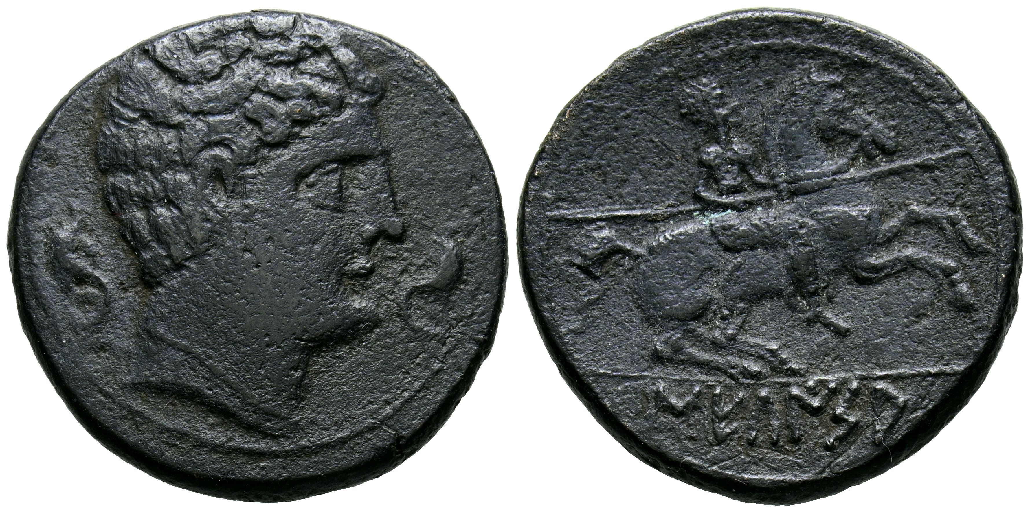 SECAISA (Segeda, Zaragoza). As. (Ae. 8.97g/25mm). 120-20 Fine (FAB-2131). Anv: Male head to the right, between two dolphins. Reverse: Horseman with lance to the right, below Iberian legend: SECaISA. VF-.