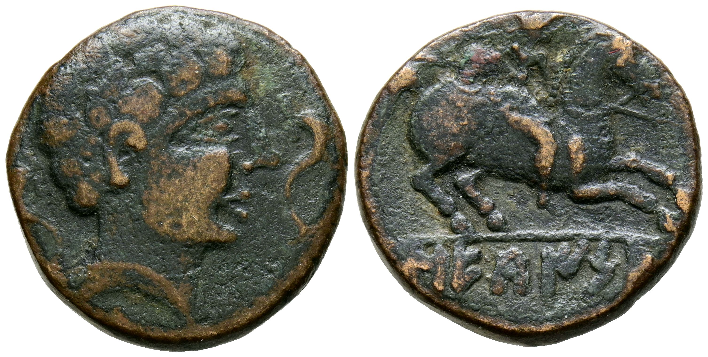 SECAISA (Segeda, Zaragoza). As. (Ae. 6.20g/21mm). 120-20 Fine (FAB-2131). Anv: Male head to the right, between two dolphins. Rev: Horseman with lance to the right, below Iberian legend: SECaISA. Good Fine.
