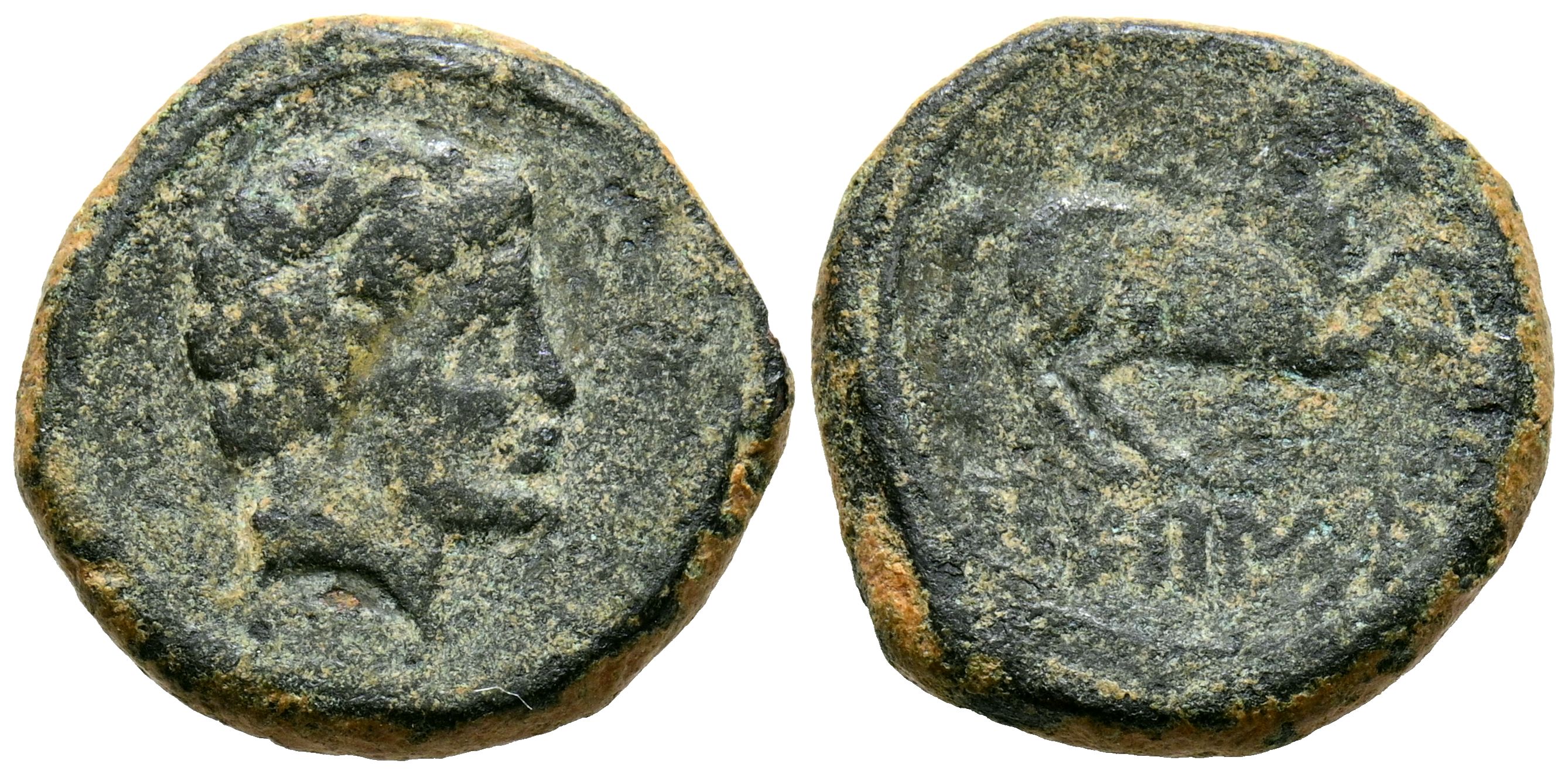 SECAISA (Segeda, Zaragoza). Semis. (Ae. 5.38g/19mm). 120-20 Fine (FAB-2146). Anv: Male head right. Rev: Horse right, below Iberian legend below line: SECaISA. Very Fine-.