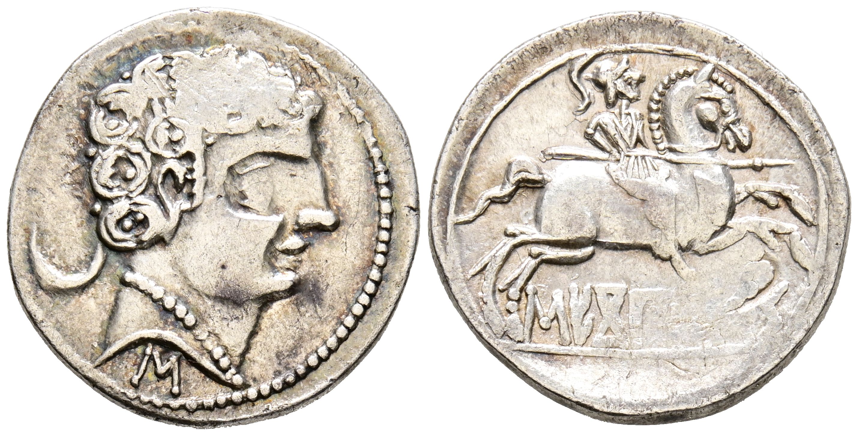 SECOBIRICES (Saelices, Cuenca). Denarius. (Ar. 3.35g/20mm). 120-30 Fine (FAB-2168). Obv: Male head to right, crescent behind, below Iberian letter: S. Rev: Horseman with lance to right, one foot sticking out, below Iberian legend on line: SECoBiRICeS. VF+. Minting gaps.