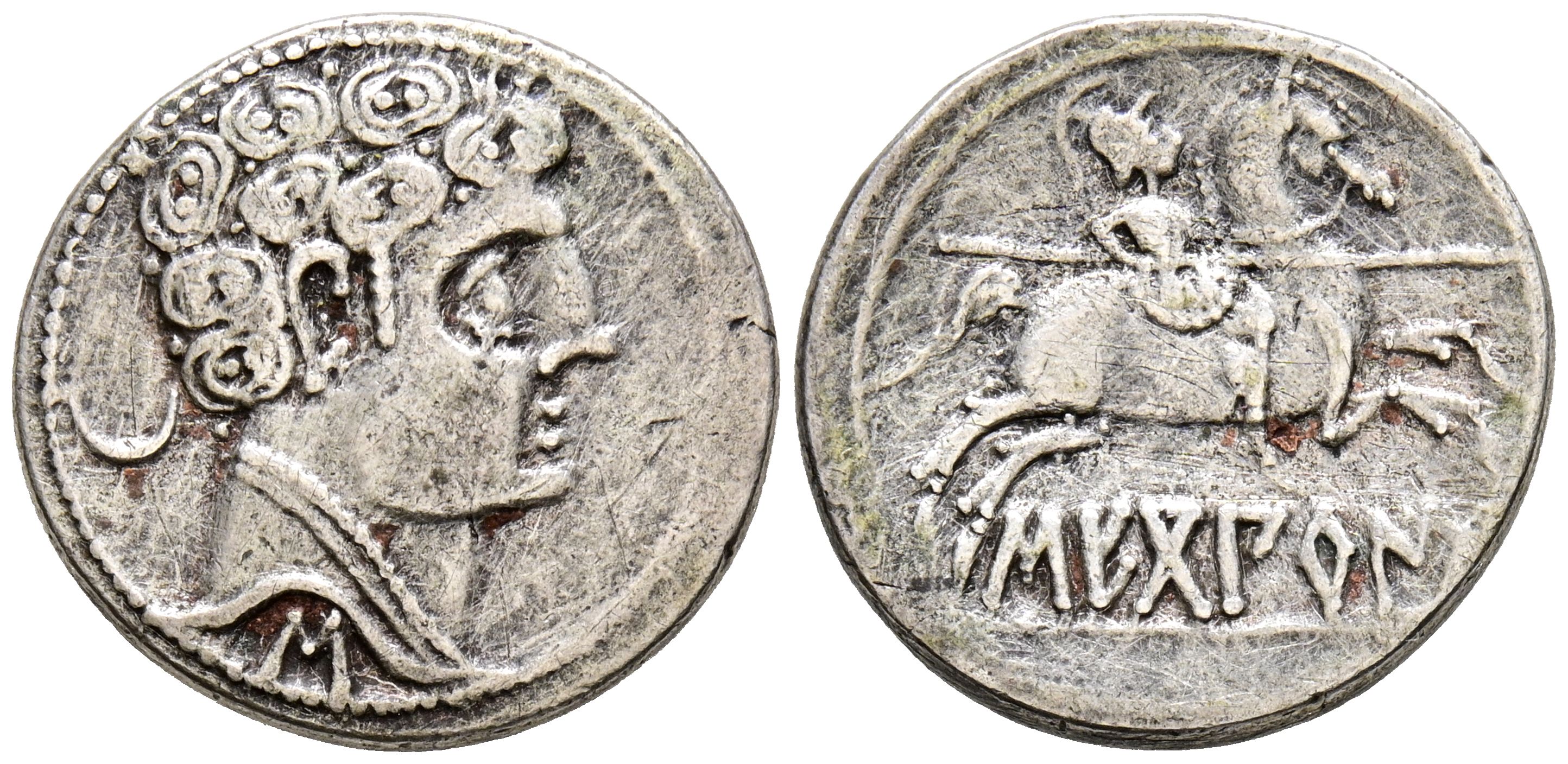 SECOBIRICES (Saelices, Cuenca). Lined denarius. (Ar-Ae. 4.20g/20mm). 120-30 Fine (FAB-2168). Anv: Male head to right, crescent behind, below Iberian letter: S. Rev: Horseman with lance to right, one foot sticking out, below Iberian legend on line: SECoBiRICeS. VF.