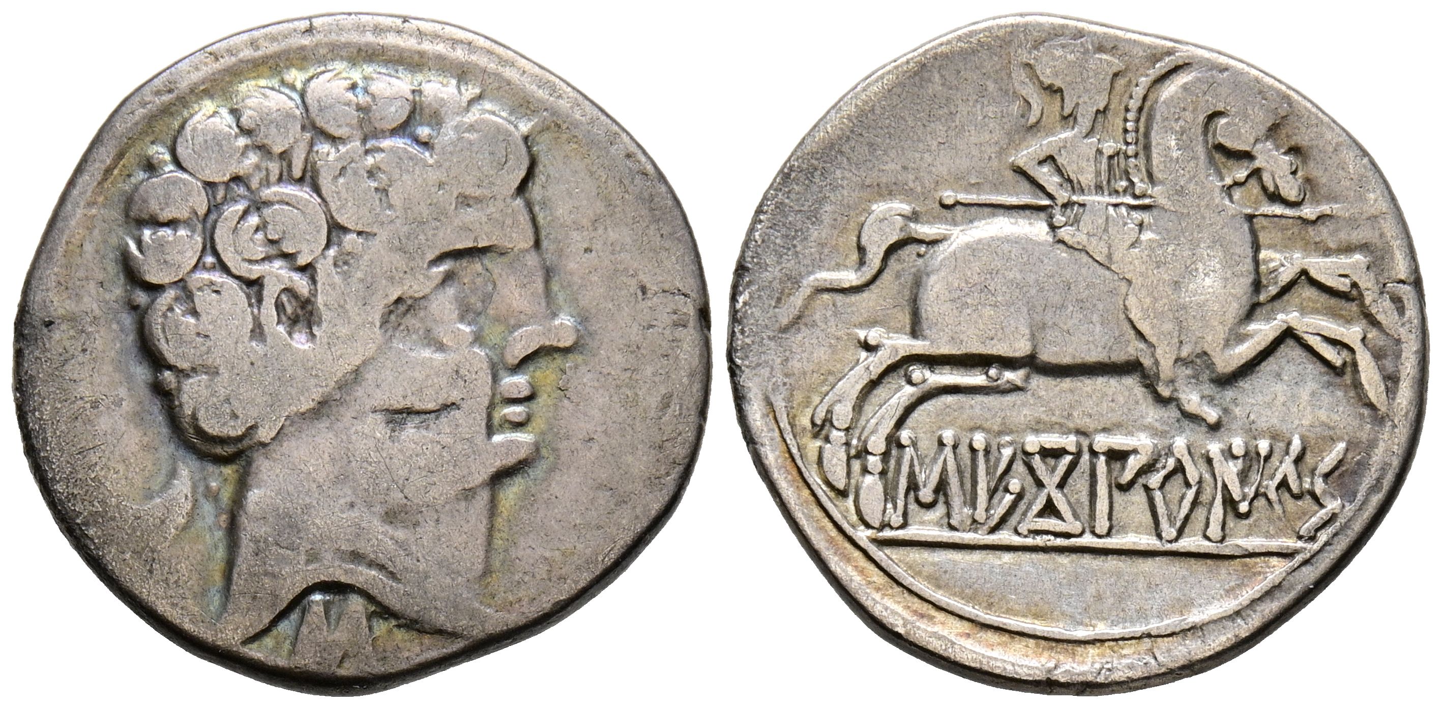 SECOBIRICES (Saelices, Cuenca). Denarius. (Ar. 3.79g/20mm). 120-30 Fine (FAB-2169). Obv: Male head to right, crescent and dot behind, below Iberian letter: S. Rev: Horseman with lance to right, one foot sticking out, below Iberian legend on line: SeCoBiRICeS. Very Fine-/Very Fine.