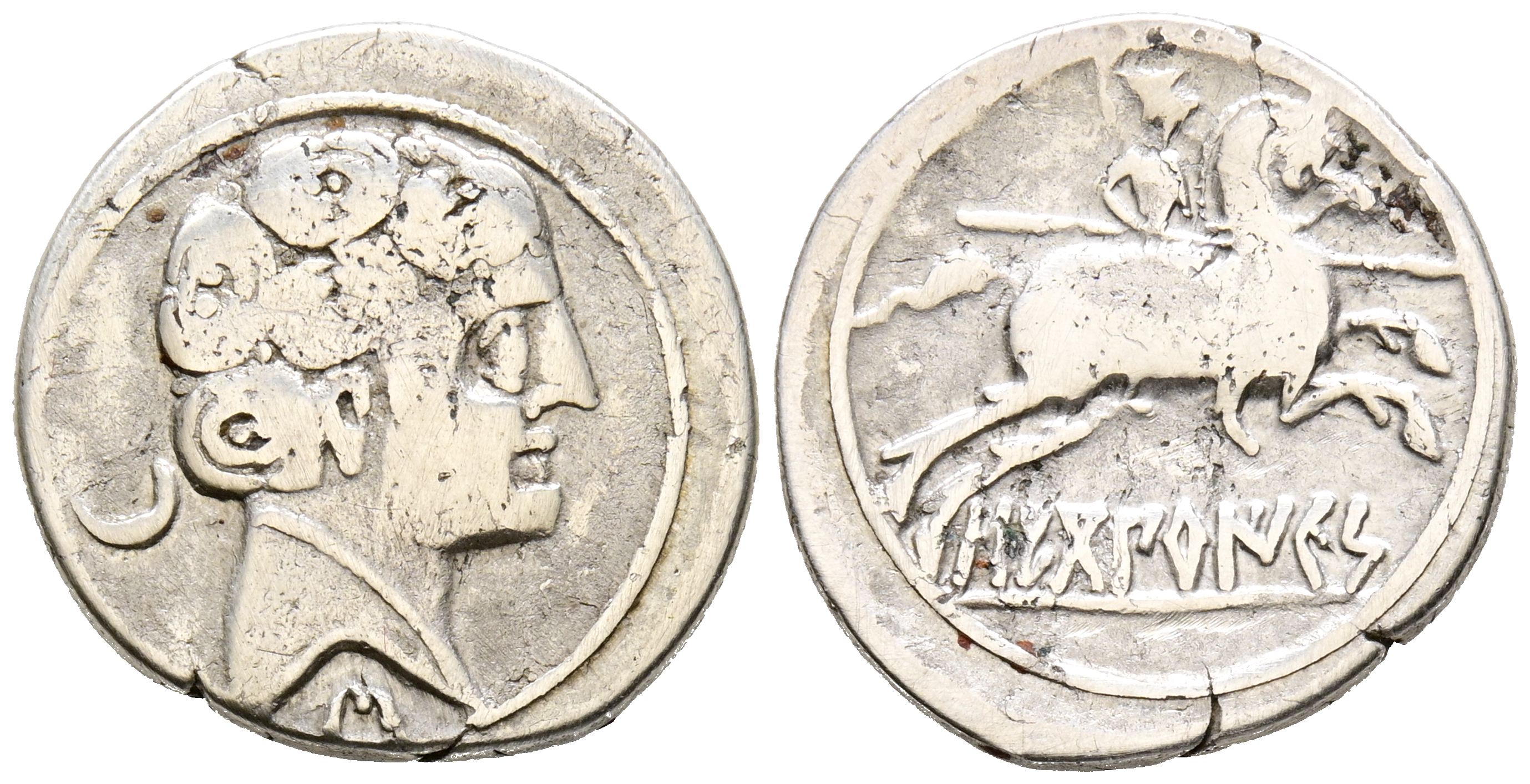 SECOBIRICES (Saelices, Cuenca). Denarius. (Ar. 3.76g/20mm). 120-30 Fine (FAB-2169). Anv: Male head to right, crescent and a dot behind, below Iberian letter: S. Rev: Horseman with lance to right, one foot sticking out, below Iberian legend on line: SECoBiRICeS. Very Fine-.