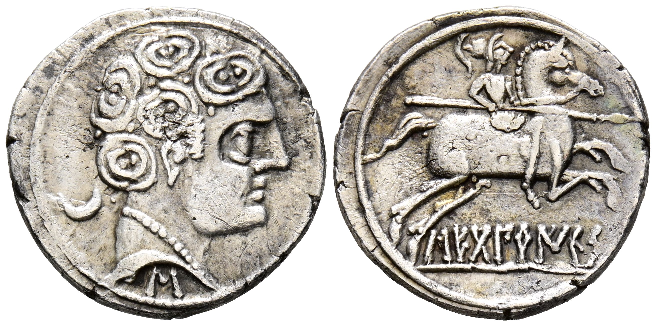 SECOBIRICES (Saelices, Cuenca). Denarius. (Ar. 4.04g/19mm). 120-30 Fine (FAB-2170). Obv: Male head to right, crescent and two dots behind, below Iberian letter: S. Rev: Horseman with lance to right, one foot sticking out, below Iberian legend on line: SeCoBiRICeS. Very Fine.