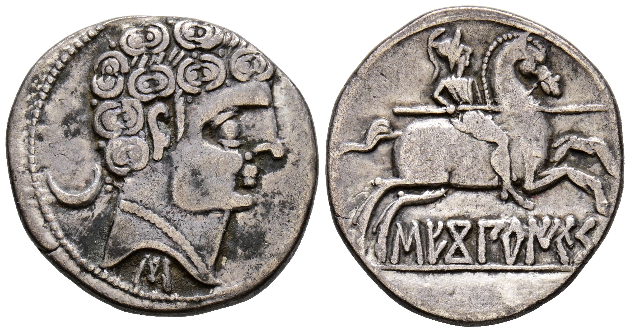 SECOBIRICES (Saelices, Cuenca). Denarius. (Ar. 2.81g/19mm). 120-30 Fine (FAB-2171). Obverse: Male head to the right, behind crescent and three dots, below Iberian letter: S. Reverse: Horseman with lance to the right, one foot sticking out. VF.